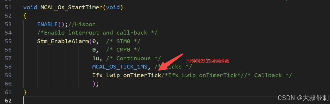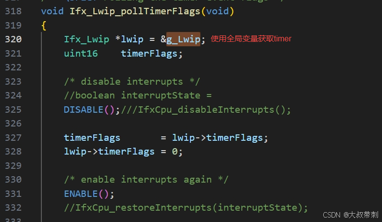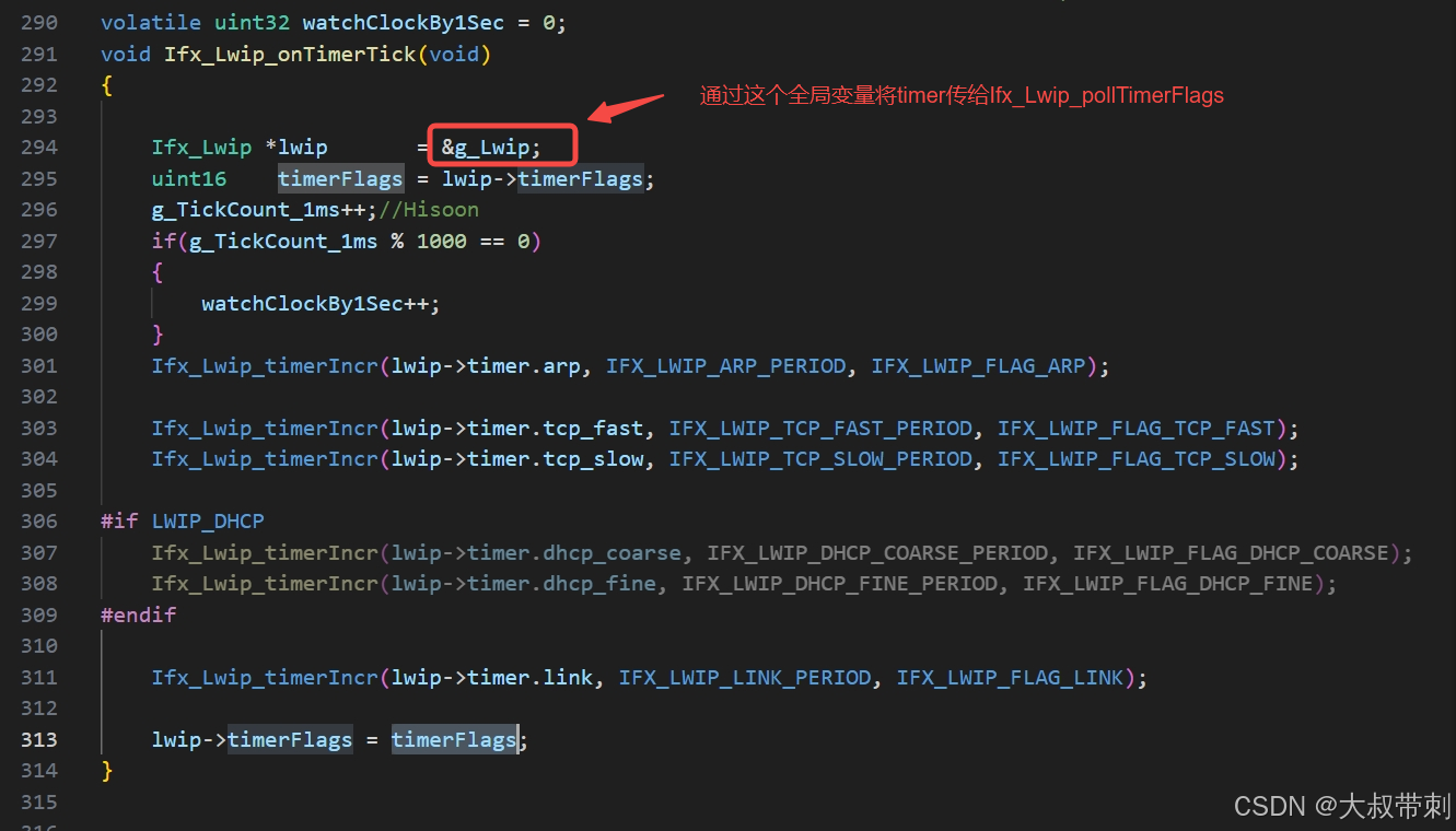Ifx_Lwip_onTimerTick函数的逻辑几乎不用改变,它会改变timer的值,然后该timer再被Ifx_Lwip_pollTimerFlags周期性调用更新。