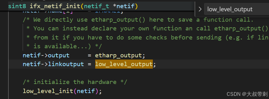 实际上low_level_output在ifx_netif_init中被绑定了,所以low_level_output就没有再对外暴露的必要。总结下来,我们要实现的最重要的3个函数就是