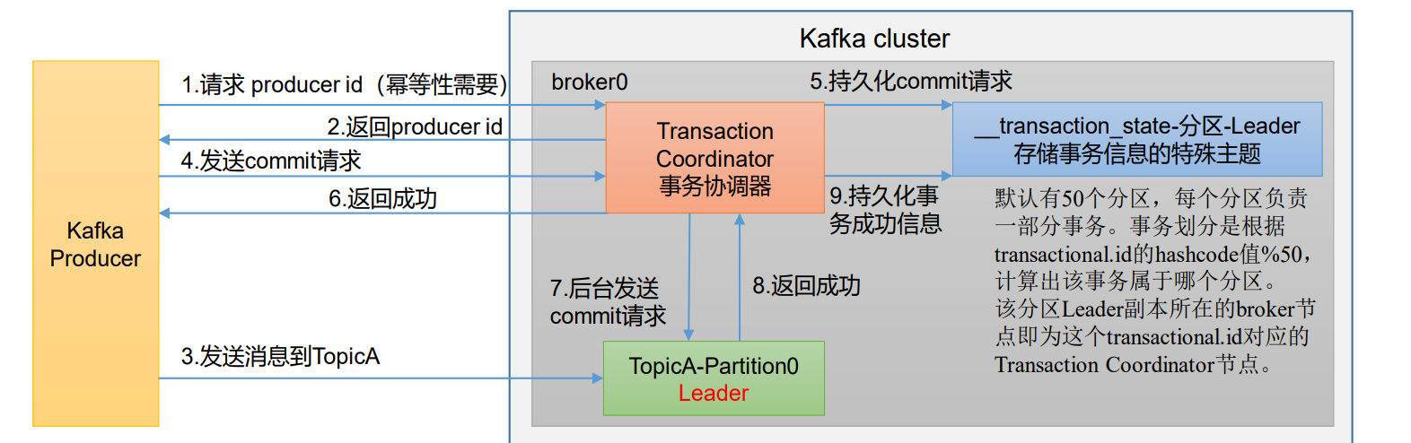 分区路由规则:根据 transactional.id 的哈希值 % 50 计算,确定事务属于哪个分区,该分区的 Leader 所在 Broker 即为对应的事务协调器节点。