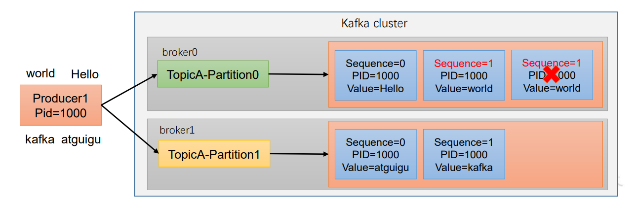 重复数据的判断标准:具有<PID, Partition, SeqNumber>相同主键的消息提交时,Broker只会持久化一条。