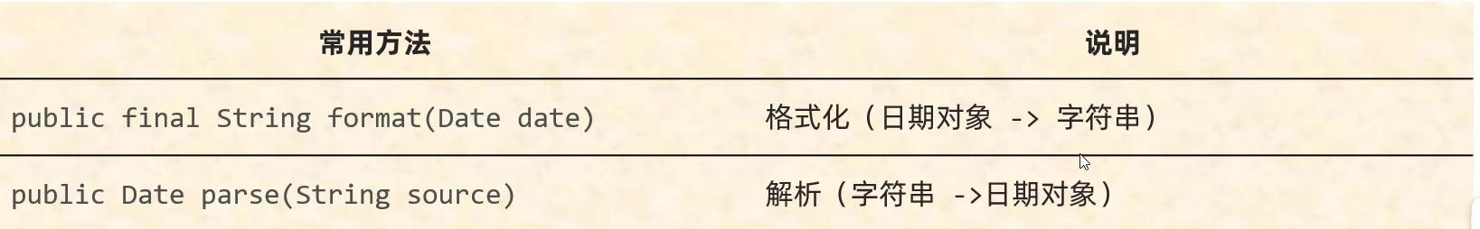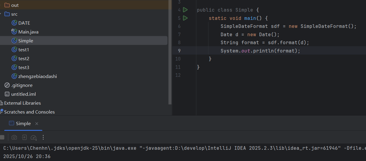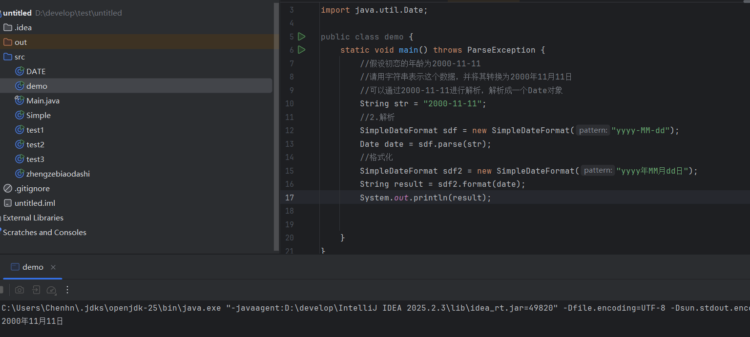 public class Simple {static void main() throws ParseException {String str = "2023-11-11 11:11:11";//利用空参构造创建SimpleDateFormat对象SimpleDateFormat sdf = new SimpleDateFormat("yyyy-MM-dd HH:mm:ss");Date date = sdf.parse(str);System.out.println(date);//}private static void method() {SimpleDateFormat sdf = new SimpleDateFormat();Date d = new Date();String format = sdf.format(d);System.out.println(format);//利用带参构造创建SimpleDateFormatSimpleDateFormat sdf2 = new SimpleDateFormat("yyyy年MM月dd日 HH:mm:ss EE");//E表示星期String format1 = sdf2.format(d);System.out.println(format1);}