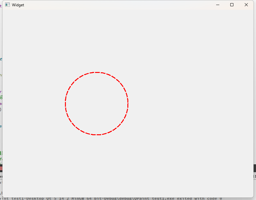{(void)event;QPainter painter(this);//this:绘制的设备QPen pen;pen.setColor(QColor(255,0,0));//设置红色的线条pen.setWidth(3);//设置线条的粗细pen.setStyle(Qt::DashLine);//设置线条的样式painter.setPen(pen);//画个圆形painter.drawEllipse(200,200,200,200);}