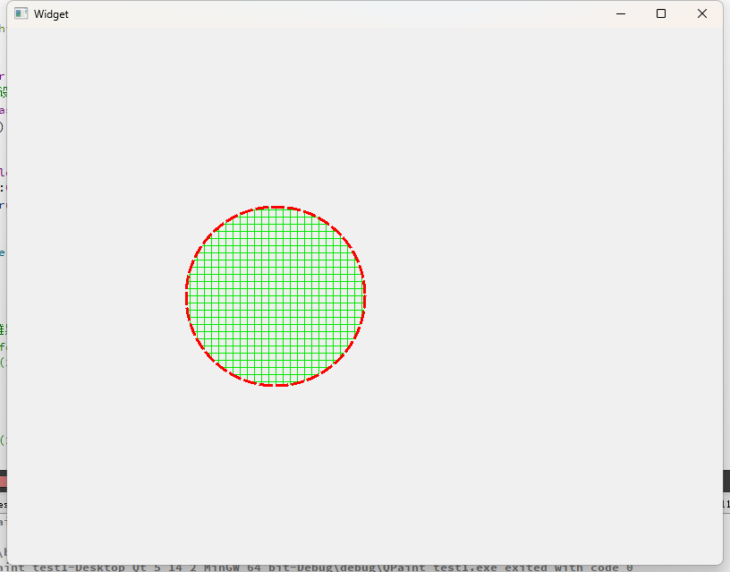 {(void)event;QPainter painter(this);//this:绘制的设备QPen pen;pen.setColor(QColor(255,0,0));//设置红色的线条pen.setWidth(3);//设置线条的粗细pen.setStyle(Qt::DashLine);//设置线条的样式painter.setPen(pen);QBrush brush;brush.setColor(QColor(0,234,0));brush.setStyle(Qt::CrossPattern);//设置填充样式painter.setBrush(brush);//画个圆形painter.drawEllipse(200,200,200,200);}