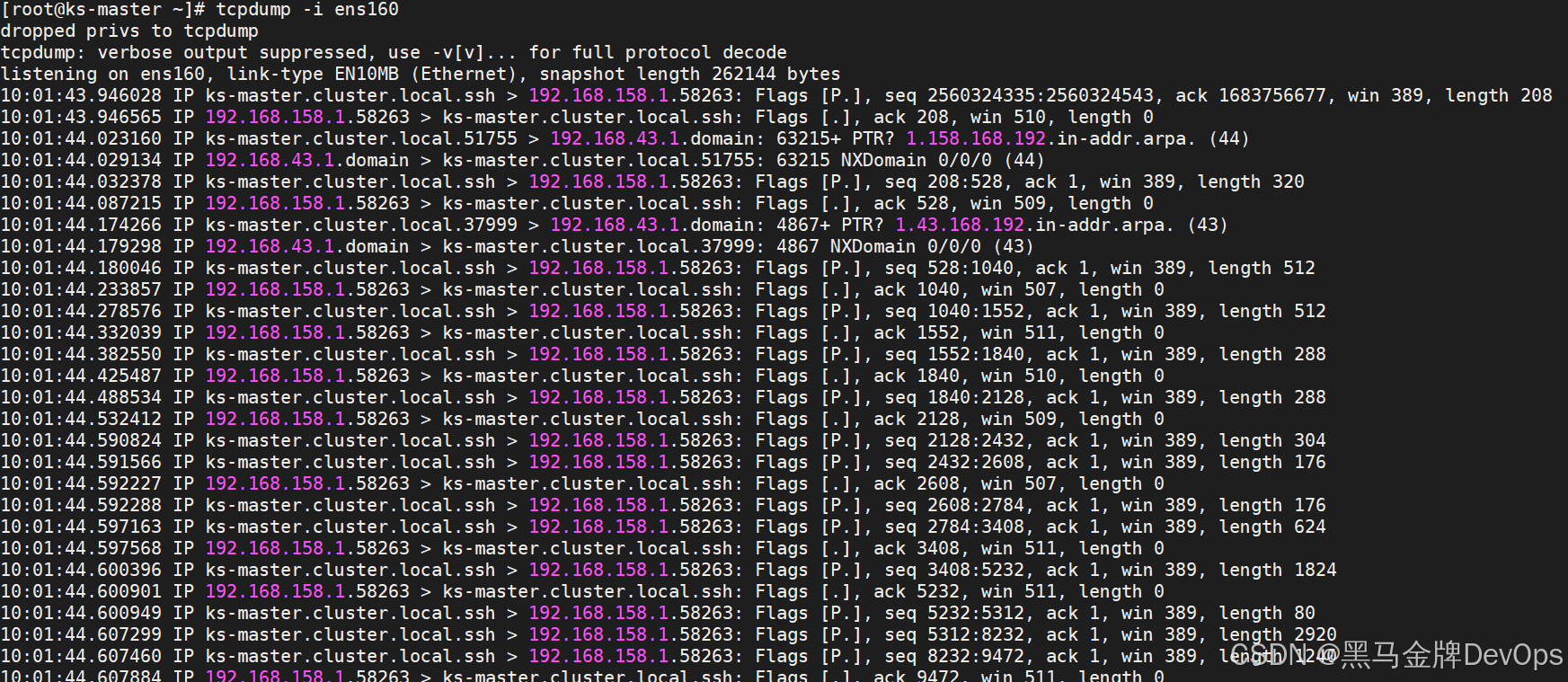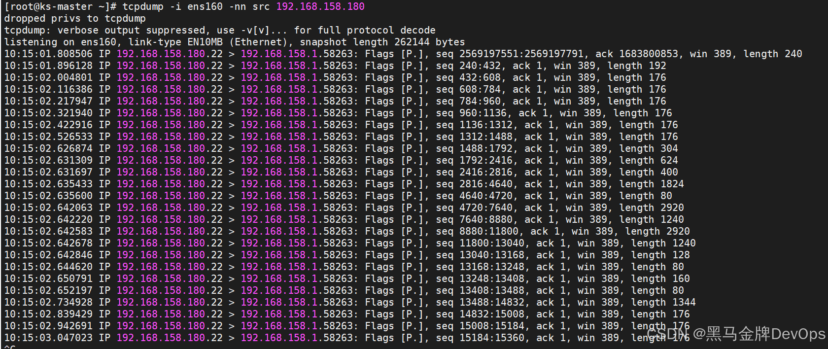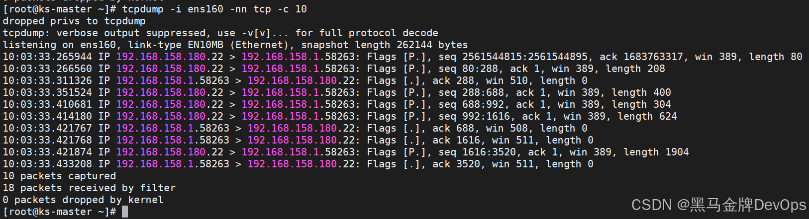 | 捕获 RST 重置包 | sudo tcpdump -i ens160 -nn tcp[13] & 4 != 0 | 排查服务崩溃、端口未监听等异常 |
