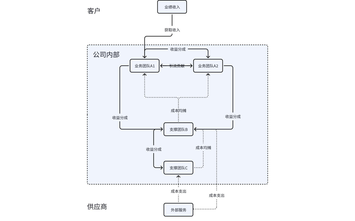每个团队都是为业务最终目标服务的,也会有对应的成本(人力,工位,IT 成本,流量)因此公司内每个团队的业务收益和成本的流动关系如下图所示。