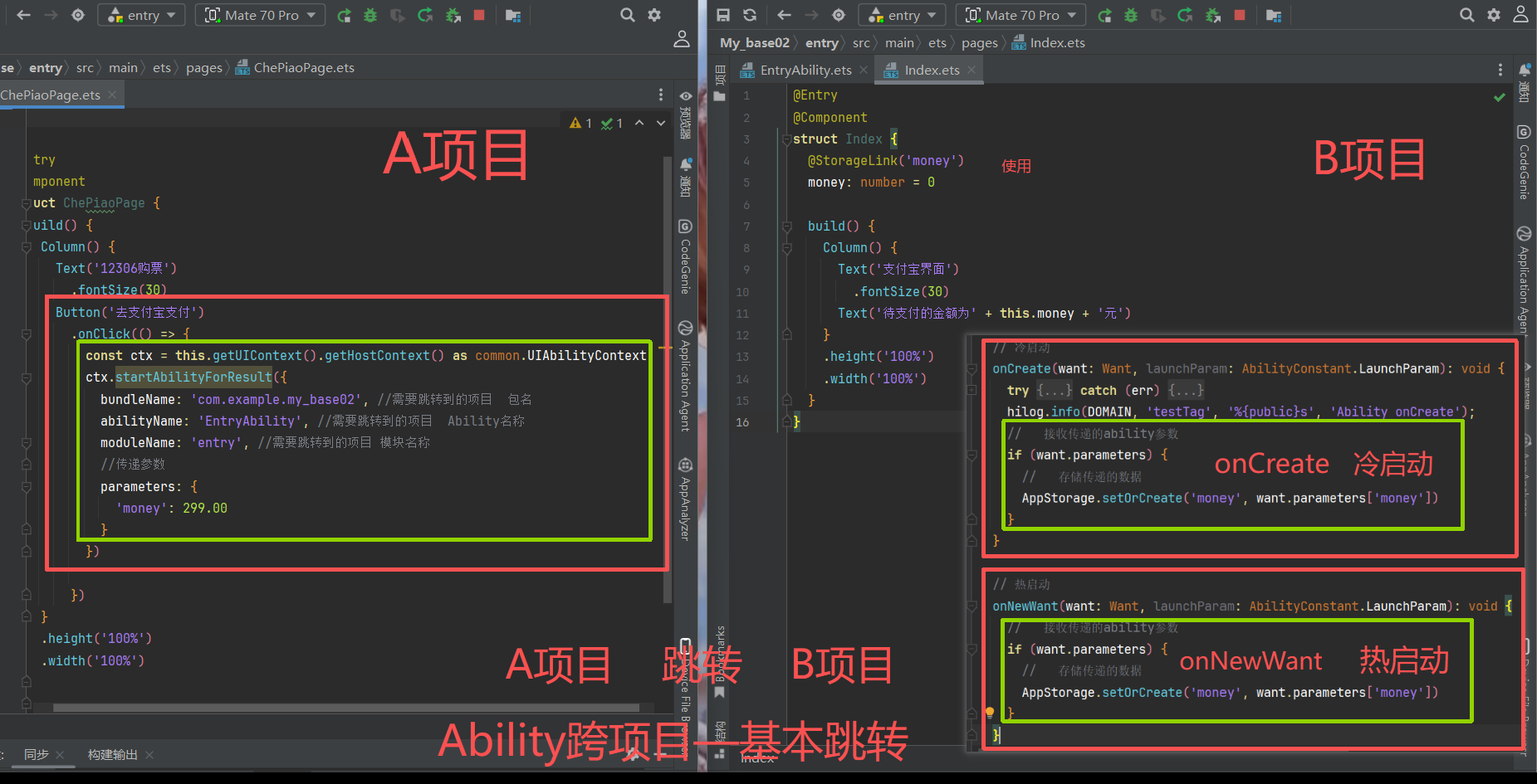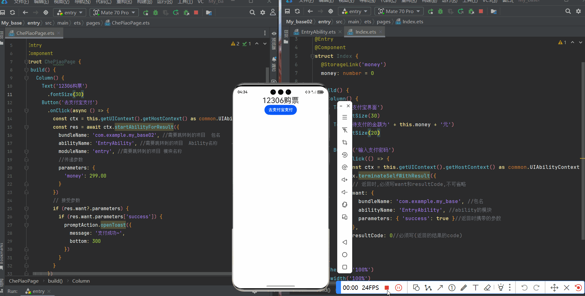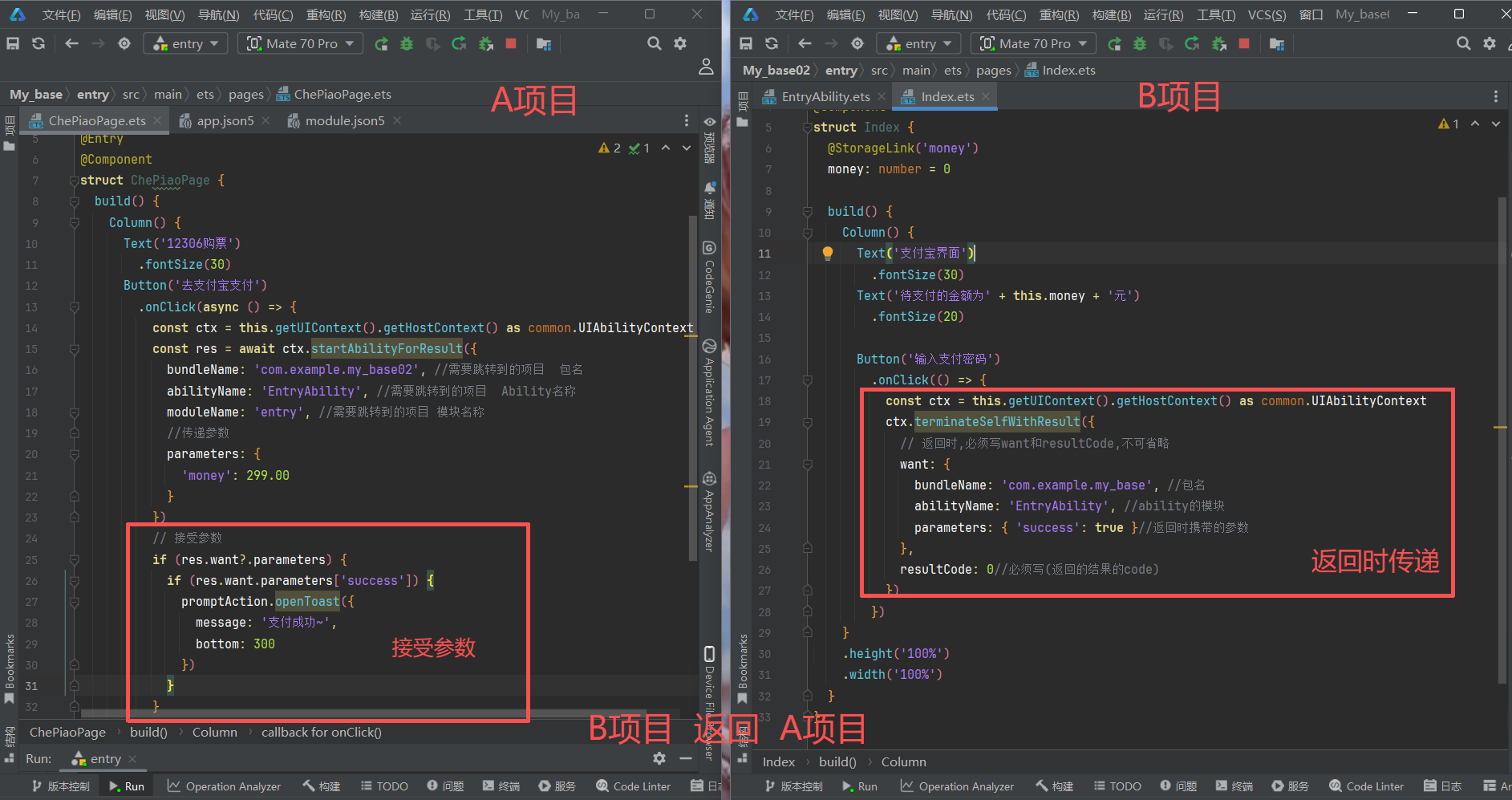 struct ChePiaoPage {build() {Column() {Text('12306购票').fontSize(30)Button('去支付宝支付').onClick(async () => {const ctx = this.getUIContext().getHostContext() as common.UIAbilityContextconst res = await ctx.startAbilityForResult({bundleName: 'com.example.my_base02', //需要跳转到的项目 包名abilityName: 'EntryAbility', //需要跳转到的项目 Ability名称moduleName: 'entry', //需要跳转到的项目 模块名称//传递参数parameters: {'money': 299.00}})// 接受参数if (res.want?.parameters) {if (res.want.parameters['success']) {promptAction.openToast({message: '支付成功~',bottom: 300})}}})}.height('100%').width('100%')}