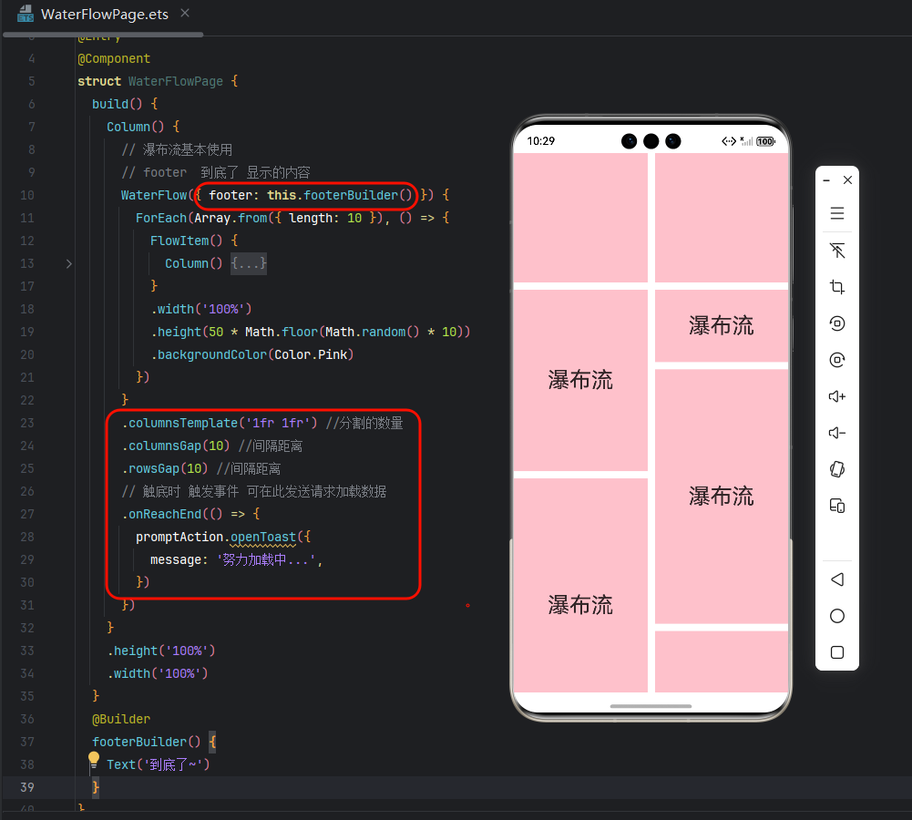 struct WaterFlowPage {build() {Column() {// 瀑布流基本使用// footer 到底了 显示的内容WaterFlow({ footer: this.footerBuilder() }) {ForEach(Array.from({ length: 10 }), () => {FlowItem() {Column() {Text('瀑布流').fontSize(30)}}.width('100%').height(50 * Math.floor(Math.random() * 10)).backgroundColor(Color.Pink)})}.columnsTemplate('1fr 1fr') //分割的数量.columnsGap(10) //间隔距离.rowsGap(10) //间隔距离// 触底时 触发事件 可在此发送请求加载数据.onReachEnd(() => {promptAction.openToast({message: '努力加载中...',})})}.height('100%').width('100%')}@BuilderfooterBuilder() {Text('到底了~')}