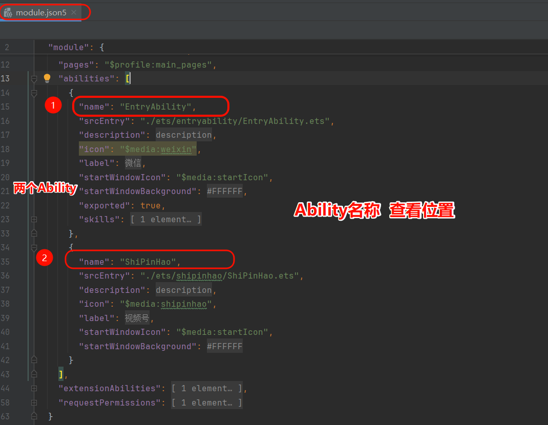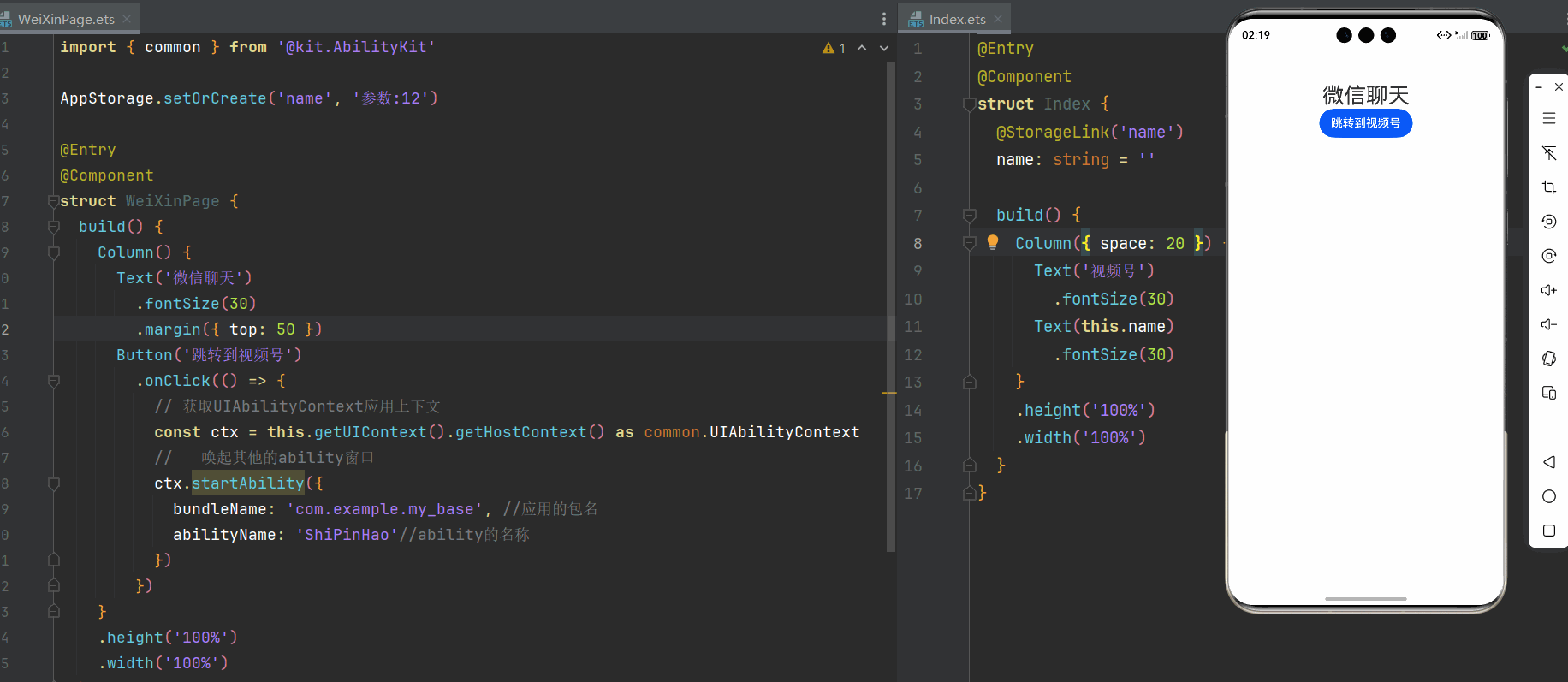 struct WeiXinPage {build() {Column() {Text('微信聊天').fontSize(30).margin({ top: 50 })Button('跳转到视频号').onClick(() => {// 获取UIAbilityContext应用上下文const ctx = this.getUIContext().getHostContext() as common.UIAbilityContext// 唤起其他的ability窗口ctx.startAbility({bundleName: 'com.example.my_base', //应用的包名abilityName: 'ShiPinHao' //ability的名称})})}.height('100%').width('100%')}