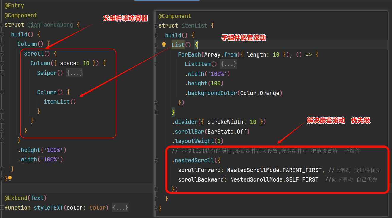 struct QianTaoHuaDong {build() {Column() {Scroll() {Column({ space: 10 }) {Swiper() {Text('1').styleTEXT(Color.Pink)Text('2').styleTEXT(Color.Blue)Text('3').styleTEXT(Color.Red)}Column() {itemList()}}}}.height('100%').width('100%')}