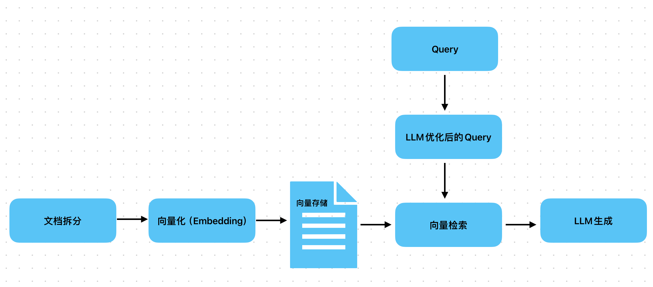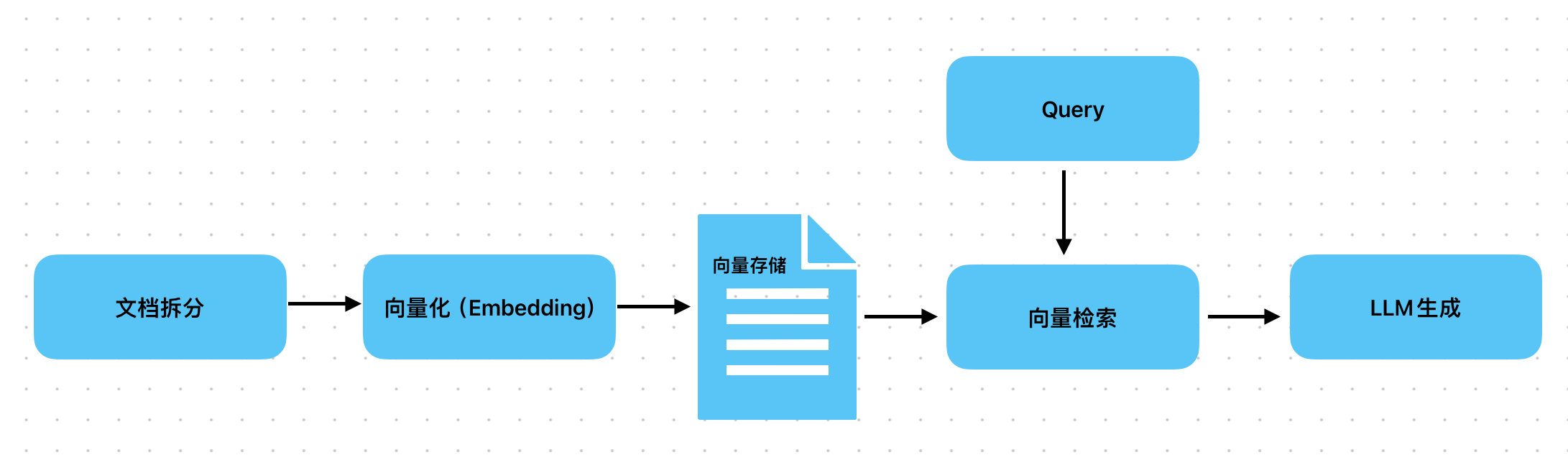 - 用户 query 转向量后,检索 Top-K 相似 chunk,直接喂给 LLM 生成答案。