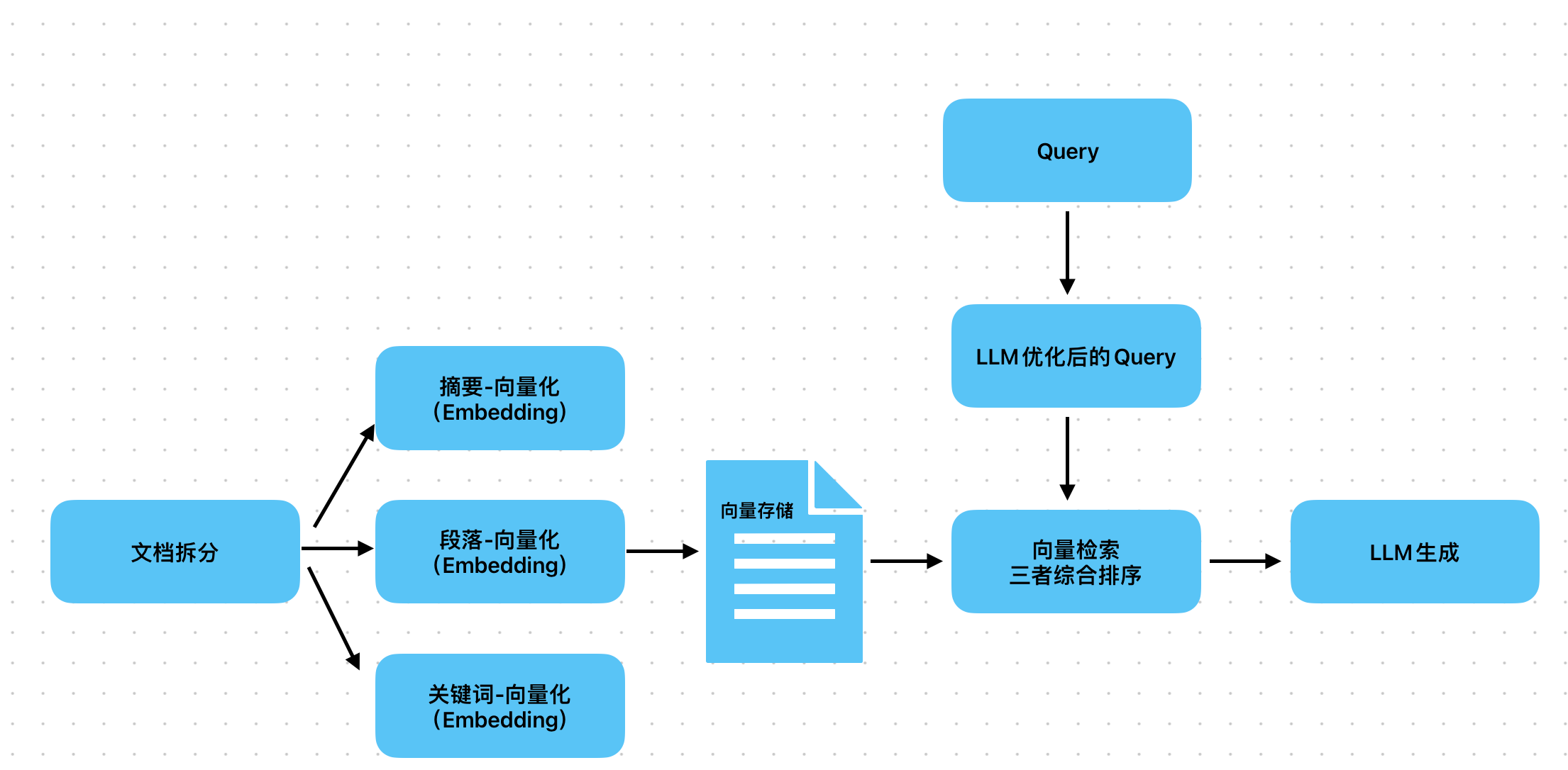 - 检索时:同时用 query 向量匹配这 3 类向量,综合排序后返回最相关的 chunk。