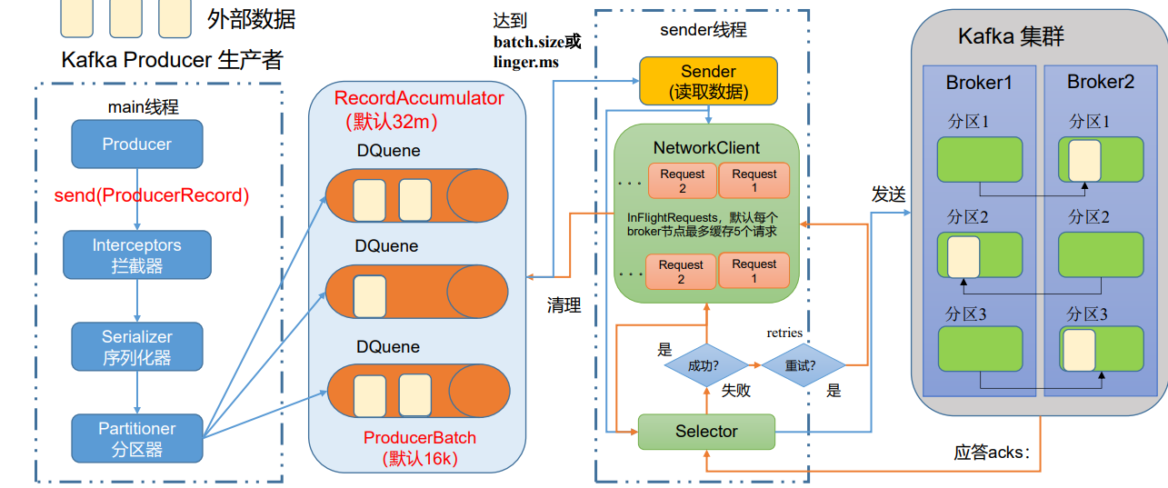 在消息发送的过程中,涉及到了两个线程:main 线程和 Sender 线程。在 main 线程中创建了一个双端队列 RecordAccumulator。main 线程将消息发送给 RecordAccumulator, Sender 线程不断从 RecordAccumulator 中拉取消息发送到 Kafka Broker。
