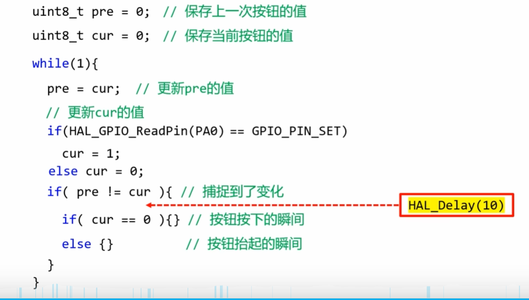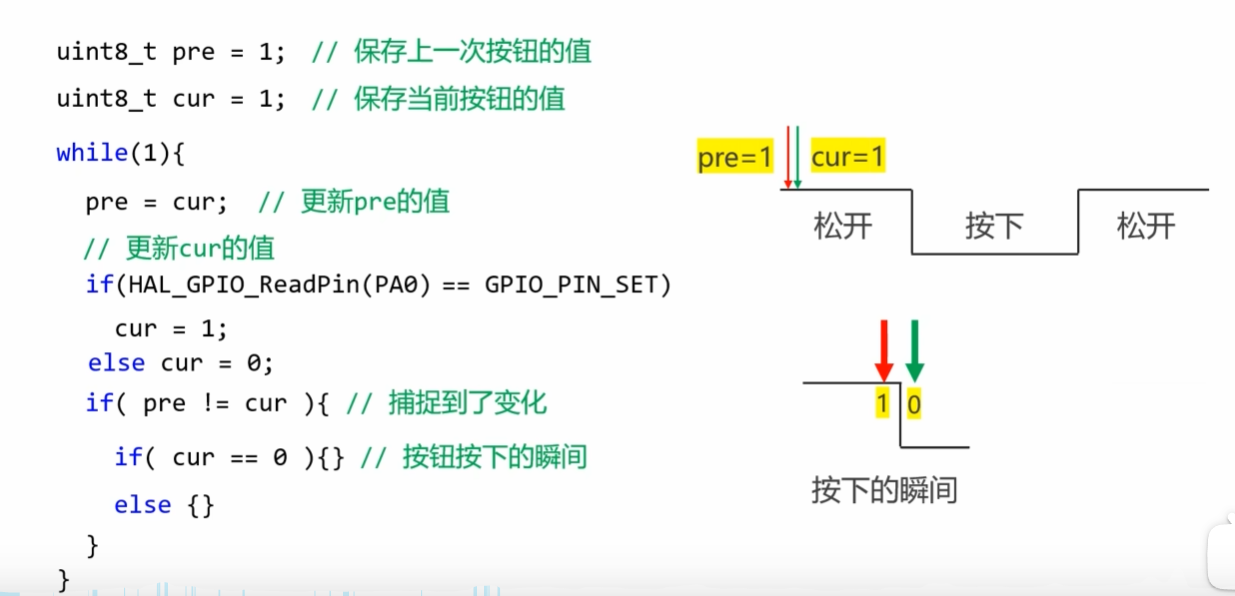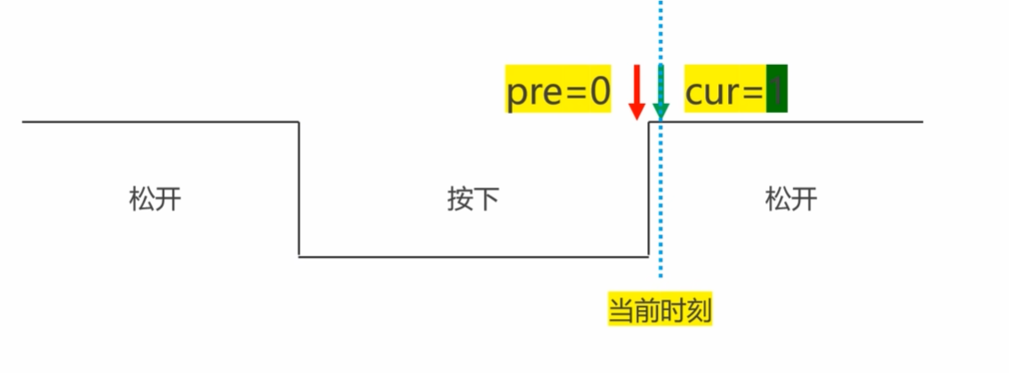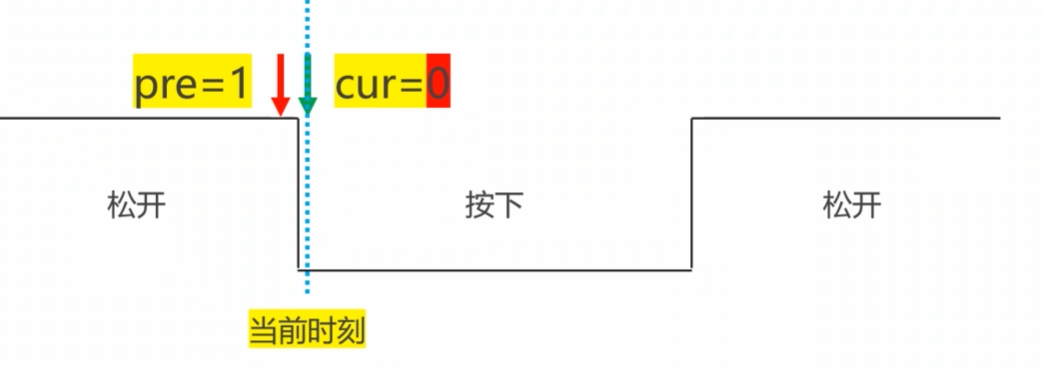 因此需要捕捉按钮变化的瞬间,pre保存按钮上一次的值,cur保存按钮当前的值,然后使用蓝色虚线保持当前时刻,不断更新pre和cur的值,当pre和cur相等,代表按钮状态没有变化,pre和cur不相等,表示捕捉到按钮变化瞬间。然后进一步判断,捕捉到了按钮按下还是抬起的动作。如果像现在这样,cur=0,则表示按钮按下,反之,按钮松开。