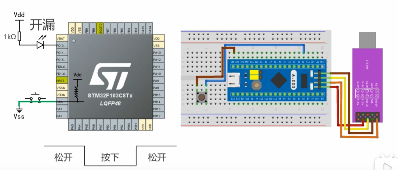 板载led连接PC13,采用开漏接法(上面的MOS一直断开),PA0接按钮,把PA0设置为输入上拉模式。松开按钮PA0被上拉电阻拉到高电压,按下按钮,PA0通过按钮接地。当我们按下按钮的时候led亮灭状态没有变化,当松开时候才有变化。