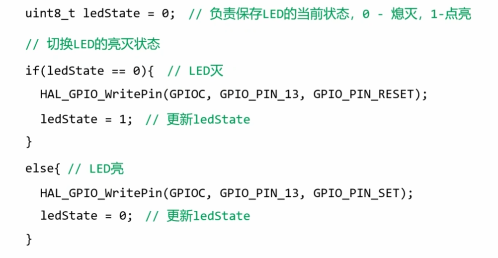 需要达到的效果是,按下按钮的时候led状态保持不变,抬起按钮瞬间,led切换亮灭状态,因此,应该把切换led亮灭的代码写在else里面。使用led_state保持led当前状态,0表示熄灭,1表示点亮。如果当前led点亮,就熄灭,并更新led_state的值,如果led熄灭,就点亮,也更新led_state的值。