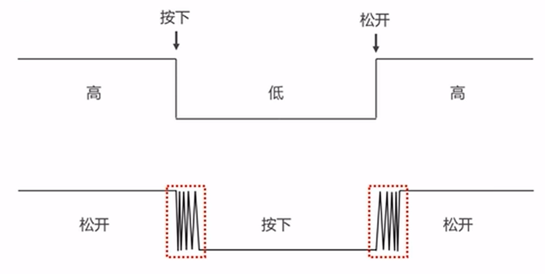 把这些代码烧录进单片机,有时候会发现代码失灵,这是由于按键抖动引起的,使用软件进行消抖,在理想情况下,当按下按钮,引脚上的电压从高电压变成低电压,当松开按钮,引脚上的电压从高电压变成低电压,但实际上,按钮存在抖动,会造成多次触发,而按钮的抖动时间,一般不会超过10ms,因此,监测到按钮动作之后,延迟10ms就可以了。