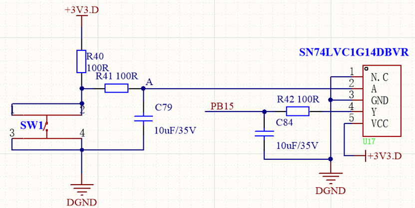 提炼重点写在这里,在使用单掷开关时,采用RC网络后接施密特反向触发器实现硬件上的消抖,开关松开处在稳定状态时,A处电平被拉高为高电平,施密特触发器输出低电平。当按钮按下时,电容通过R41放电, A处的电压从高电平下降到低电平,放电时长由RC控制,在A处电压降低到施密特反向触发器的低电平阈值Vth-后,输出Y翻转为高电平,这个放电时长刚好弥补了按钮的跳变时间,所以有效实现了硬件的消抖。按钮松开同理,这里不再次赘述。