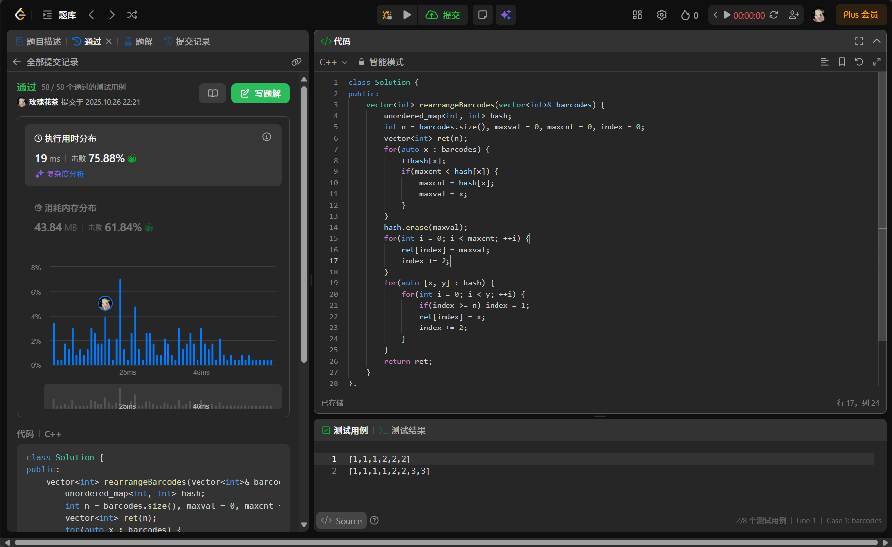 public:vector<int> rearrangeBarcodes(vector<int>& barcodes) {unordered_map<int, int> hash;int n = barcodes.size(), maxval = 0, maxcnt = 0, index = 0;vector<int> ret(n);for(auto x : barcodes) {++hash[x];if(maxcnt < hash[x]) {maxcnt = hash[x];maxval = x;}}hash.erase(maxval);for(int i = 0; i < maxcnt; ++i) {ret[index] = maxval;index += 2;}for(auto [x, y] : hash) {for(int i = 0; i < y; ++i) {if(index >= n) index = 1;ret[index] = x;index += 2;}}return ret;}