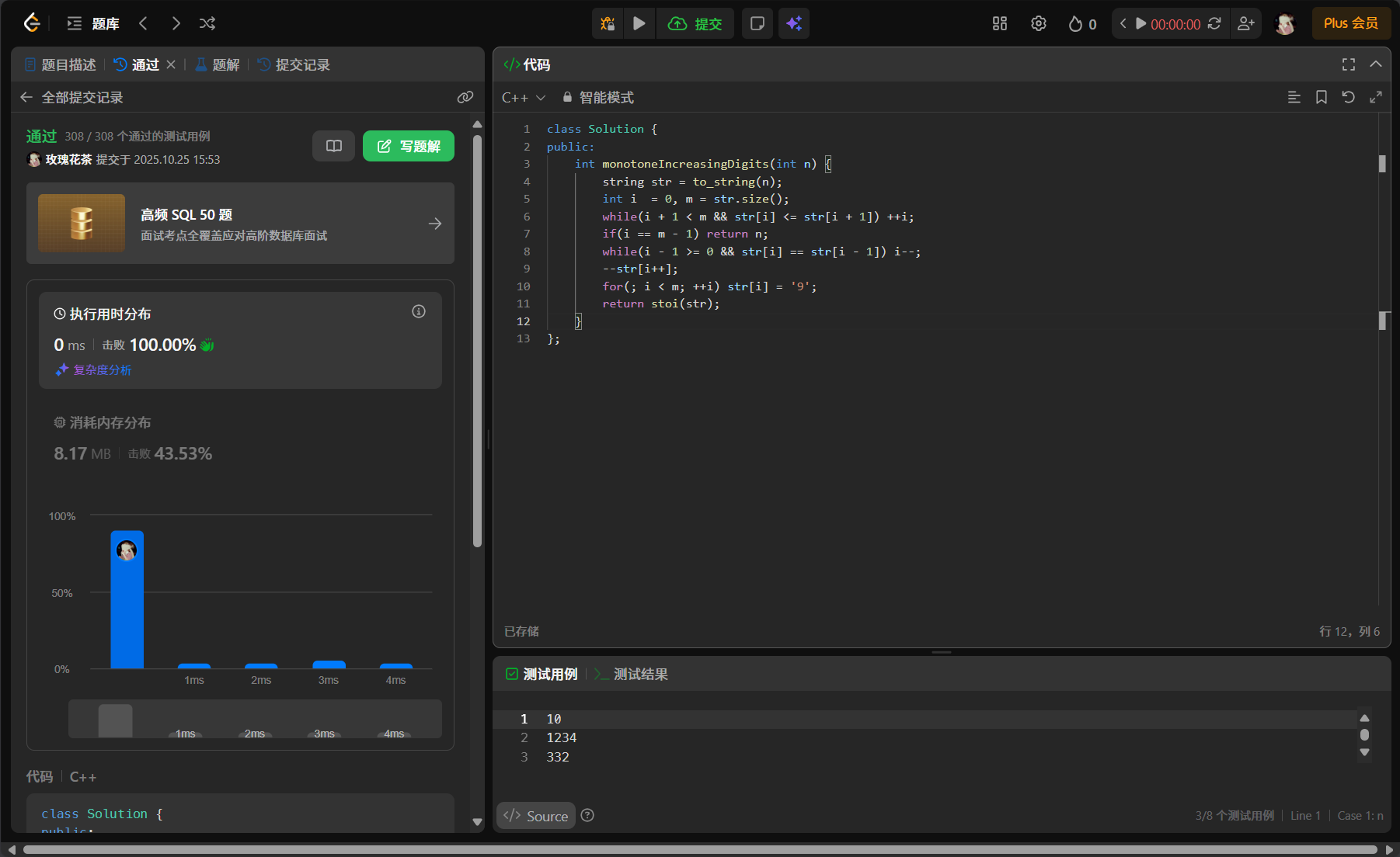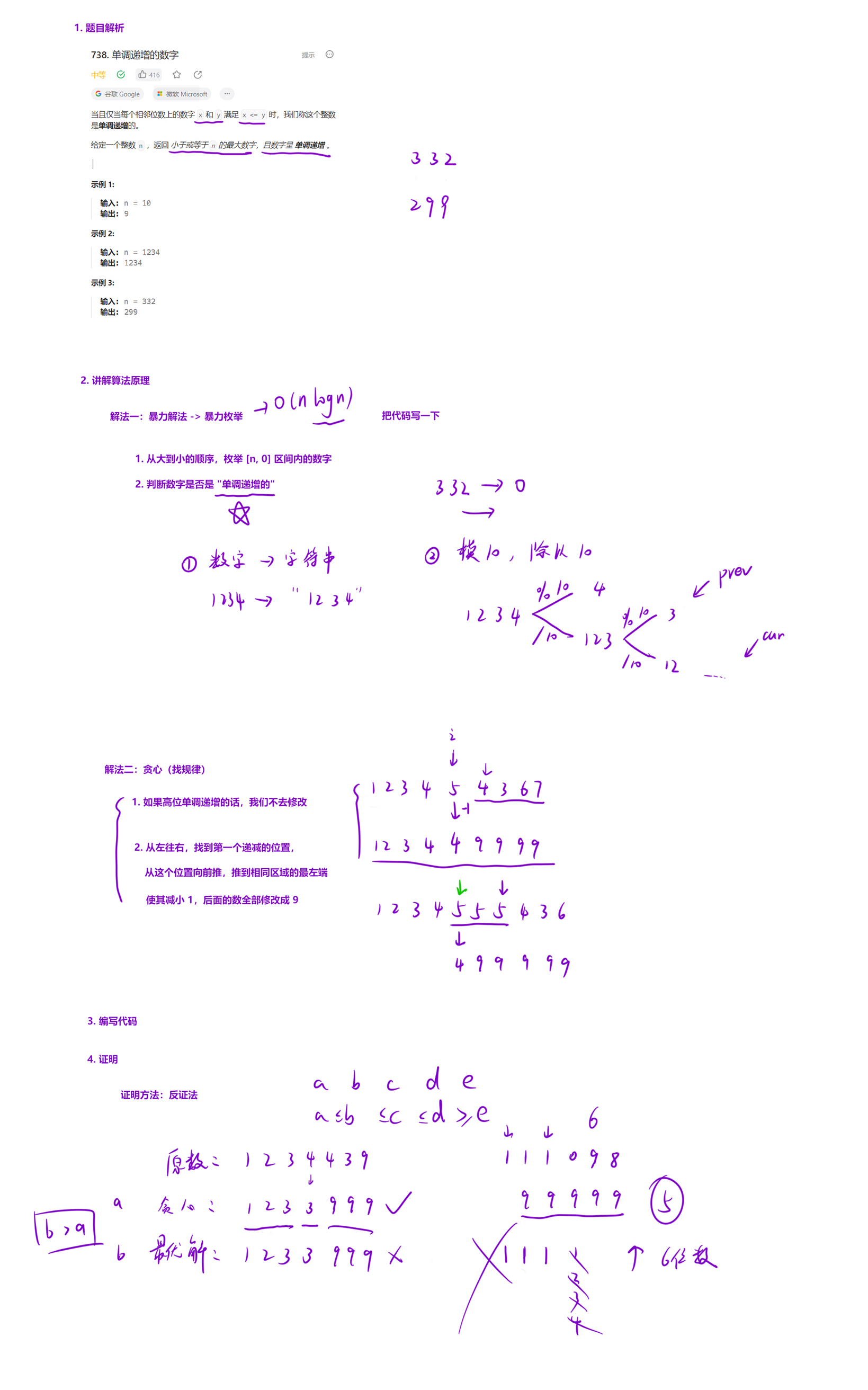 public:int monotoneIncreasingDigits(int n) {string str = to_string(n);int i = 0, m = str.size();while(i + 1 < m && str[i] <= str[i + 1]) ++i;if(i == m - 1) return n;while(i - 1 >= 0 && str[i] == str[i - 1]) i--;--str[i++];for(; i < m; ++i) str[i] = '9';return stoi(str);}