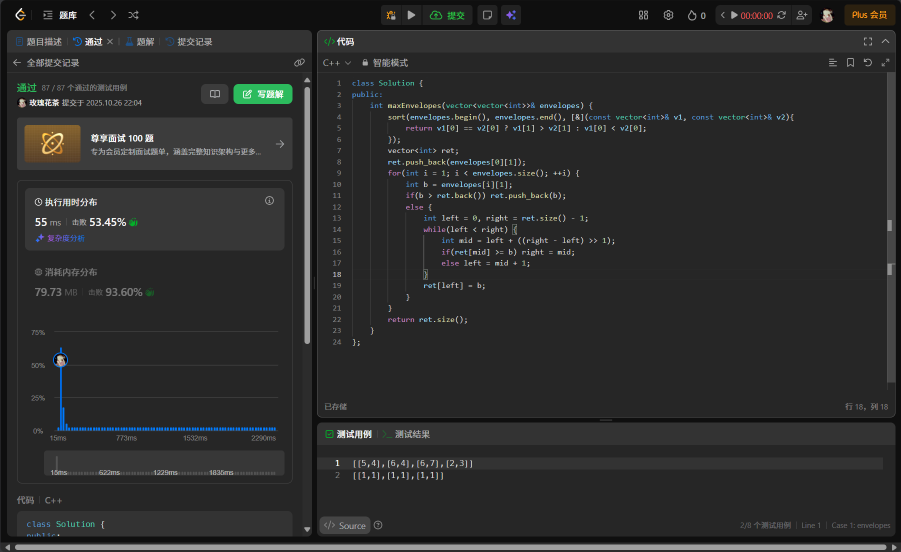 public:int maxEnvelopes(vector<vector<int>>& envelopes) {sort(envelopes.begin(), envelopes.end(), [&](const vector<int>& v1, const vector<int>& v2){return v1[0] == v2[0] ? v1[1] > v2[1] : v1[0] < v2[0]; });vector<int> ret;ret.push_back(envelopes[0][1]);for(int i = 1; i < envelopes.size(); ++i) {int b = envelopes[i][1];if(b > ret.back()) ret.push_back(b);else {int left = 0, right = ret.size() - 1;while(left < right) {int mid = left + ((right - left) >> 1);if(ret[mid] >= b) right = mid;else left = mid + 1;}ret[left] = b;}}return ret.size();}