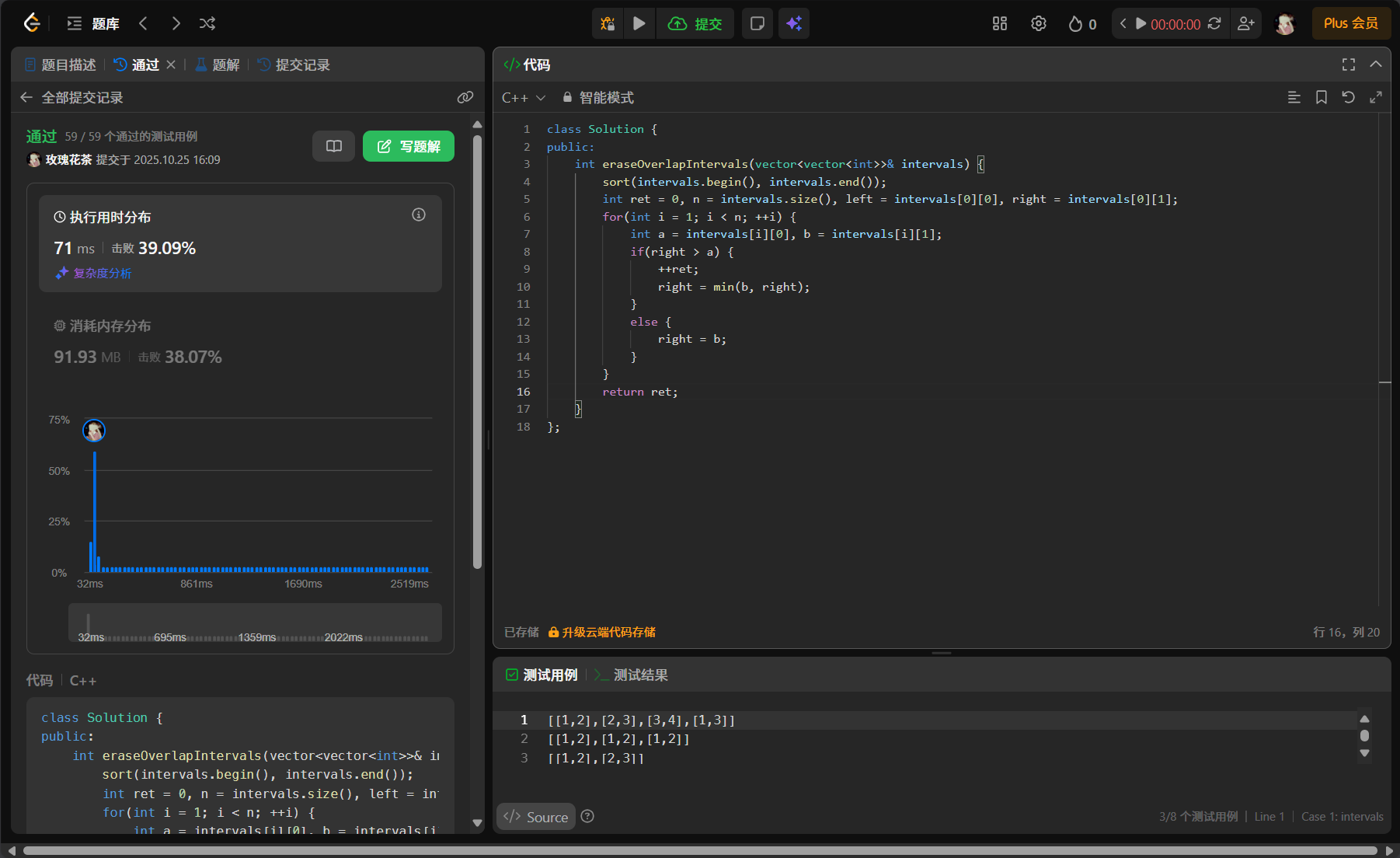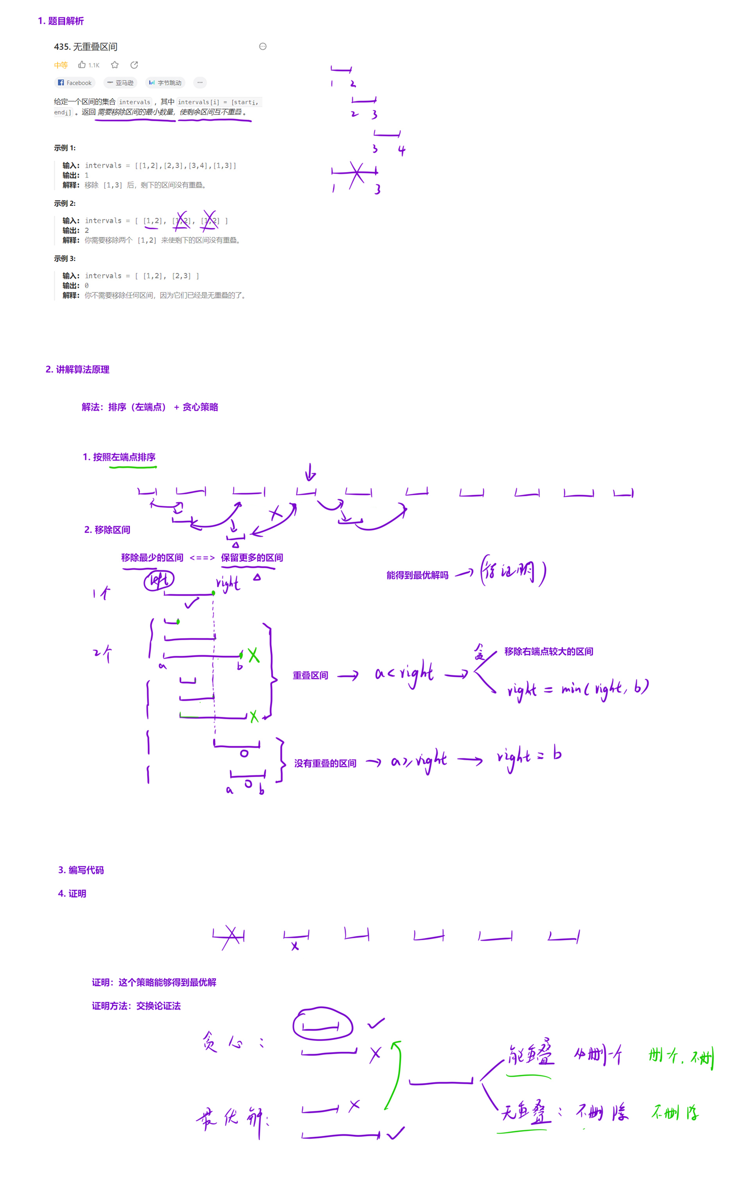 由于已经按照「左端点」排序了,因此两个区间重叠的时候,我们应该移除「右端点较大」的区间。