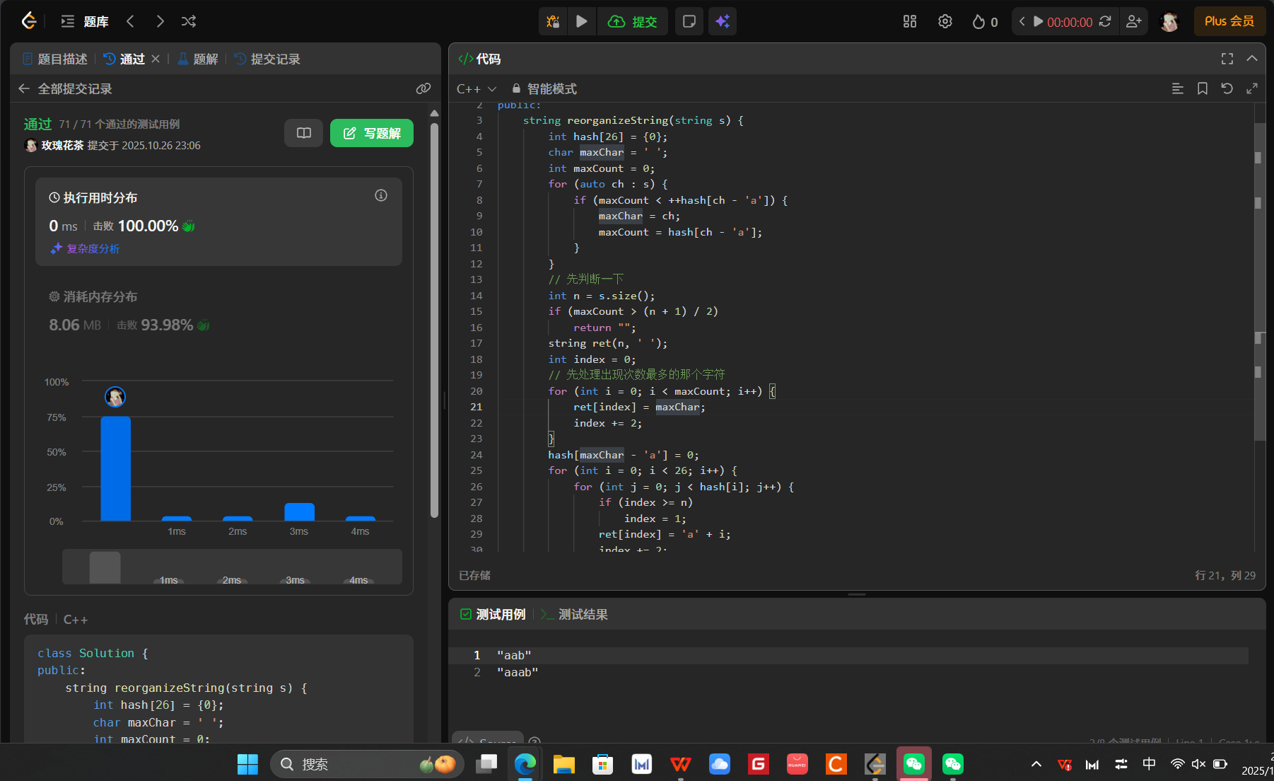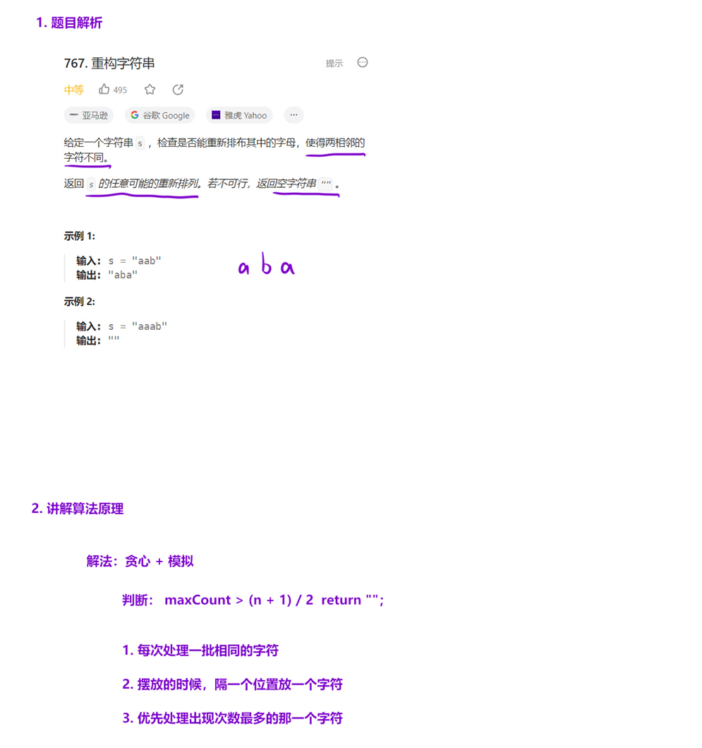 public:string reorganizeString(string s) {int hash[26] = {0};char maxChar = ' ';int maxCount = 0;for (auto ch : s) {if (maxCount < ++hash[ch - 'a']) {maxChar = ch;maxCount = hash[ch - 'a'];}}// 先判断⼀下int n = s.size();if (maxCount > (n + 1) / 2)return "";string ret(n, ' ');int index = 0;// 先处理出现次数最多的那个字符for (int i = 0; i < maxCount; i++) {ret[index] = maxChar;index += 2;}hash[maxChar - 'a'] = 0;for (int i = 0; i < 26; i++) {for (int j = 0; j < hash[i]; j++) {if (index >= n)index = 1;ret[index] = 'a' + i;index += 2;}}return ret;}