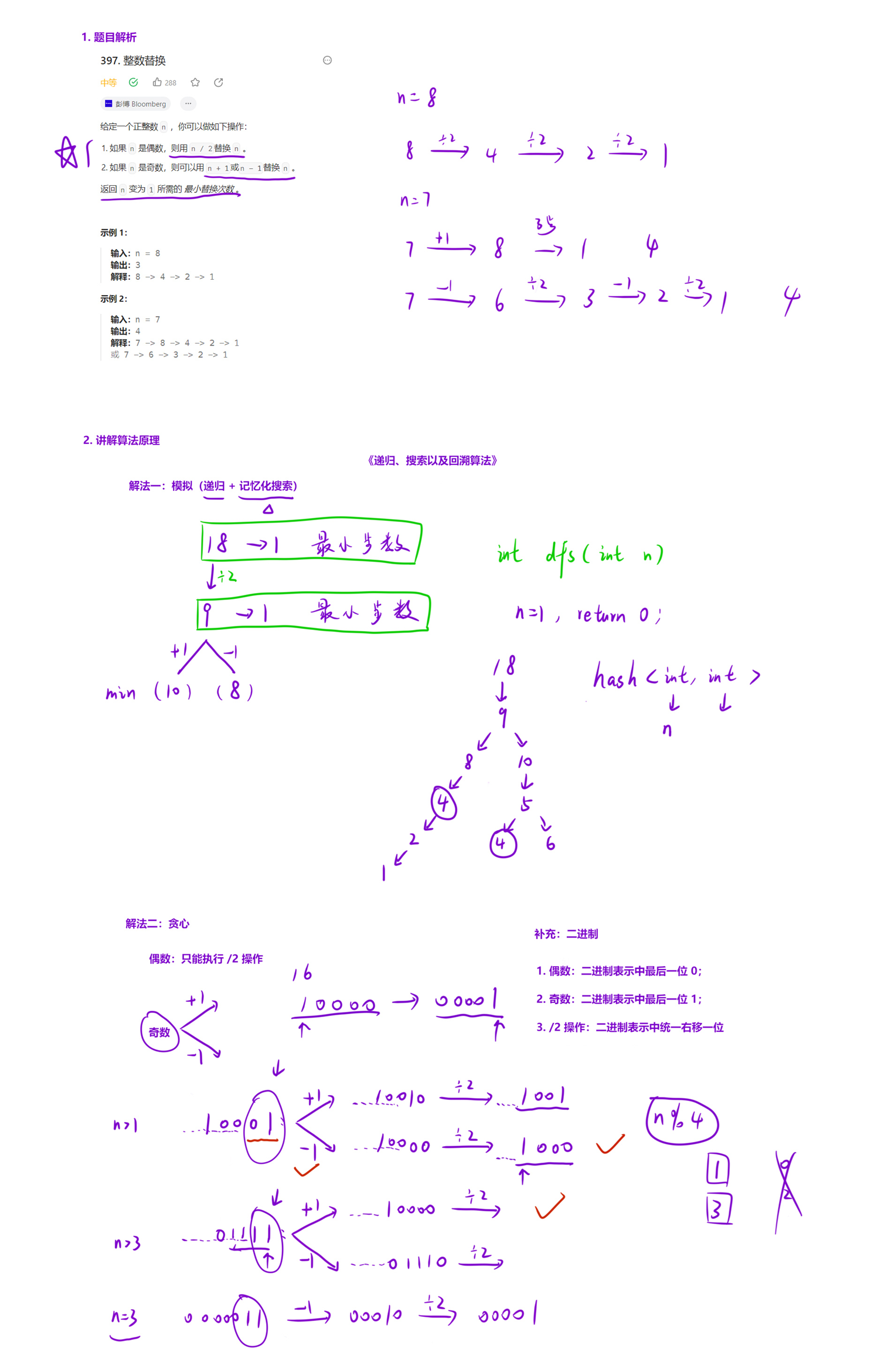 public:unordered_map<int, int> hash;int integerReplacement(int n) {return dfs(n);}int dfs(long long n) {if(hash.count(n)) return hash[n];if(n == 1) {hash[1] = 0;return 0;}if(n % 2 == 0) {hash[n] = 1 + dfs(n / 2);return hash[n];}else {hash[n] = 1 + min(dfs(n - 1), dfs(n + 1));return hash[n];}}