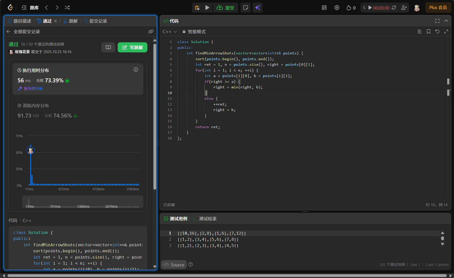 public:int findMinArrowShots(vector<vector<int>>& points) {sort(points.begin(), points.end());int ret = 1, n = points.size(), right = points[0][1];for(int i = 1; i < n; ++i) {int a = points[i][0], b = points[i][1];if(right >= a) {right = min(right, b);}else {++ret;right = b;}}return ret;}
