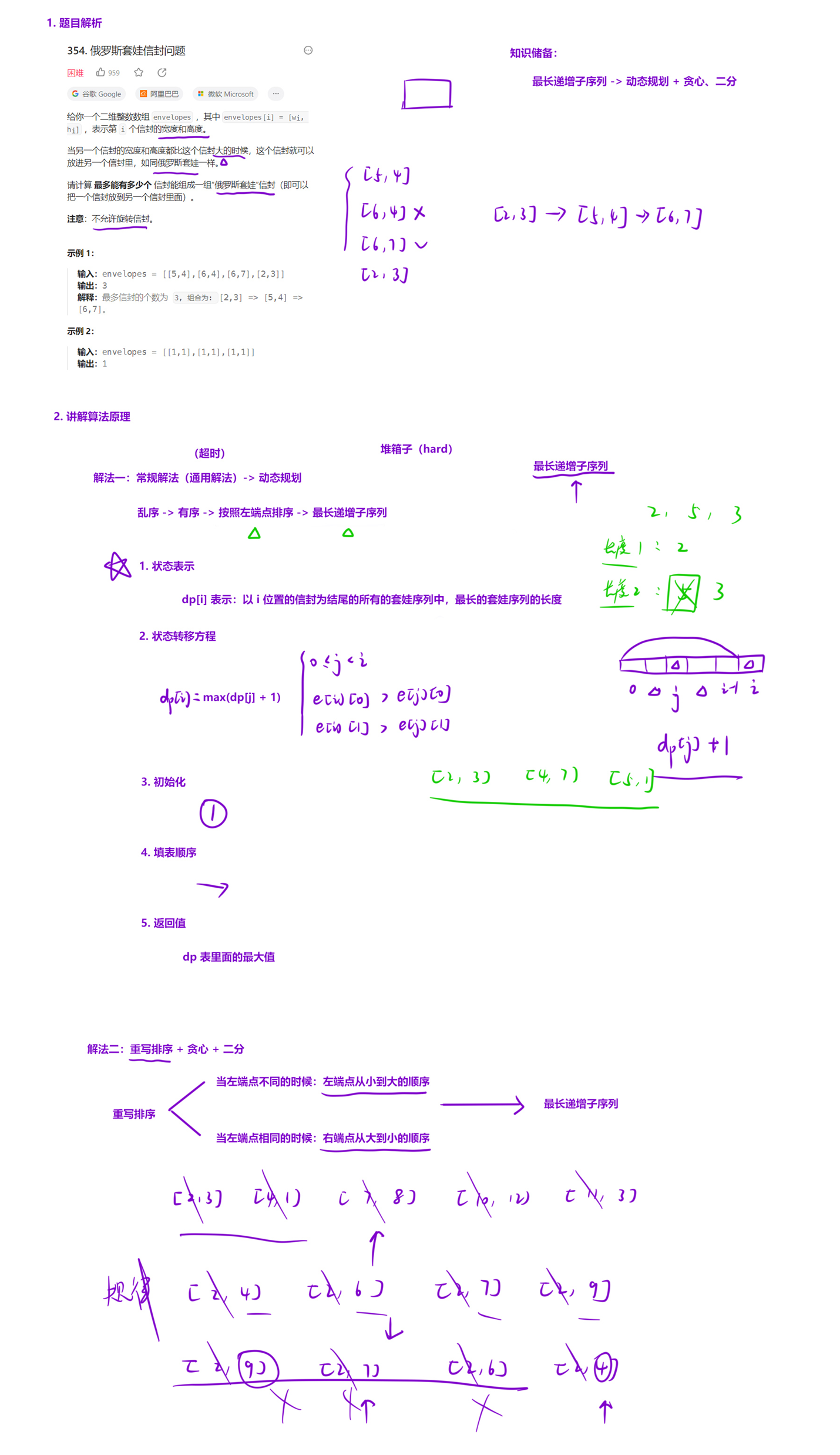 - ii. 左端点相同的时候:按照「右端点从大到小」排序我们发现,问题就变成了仅考虑信封的「右端点」,完完全全的变成的「最长上升子序列」的模型。那么我们就可以用「贪心 + 二分」优化我们的算法。