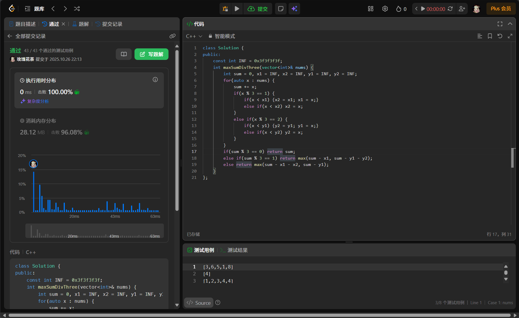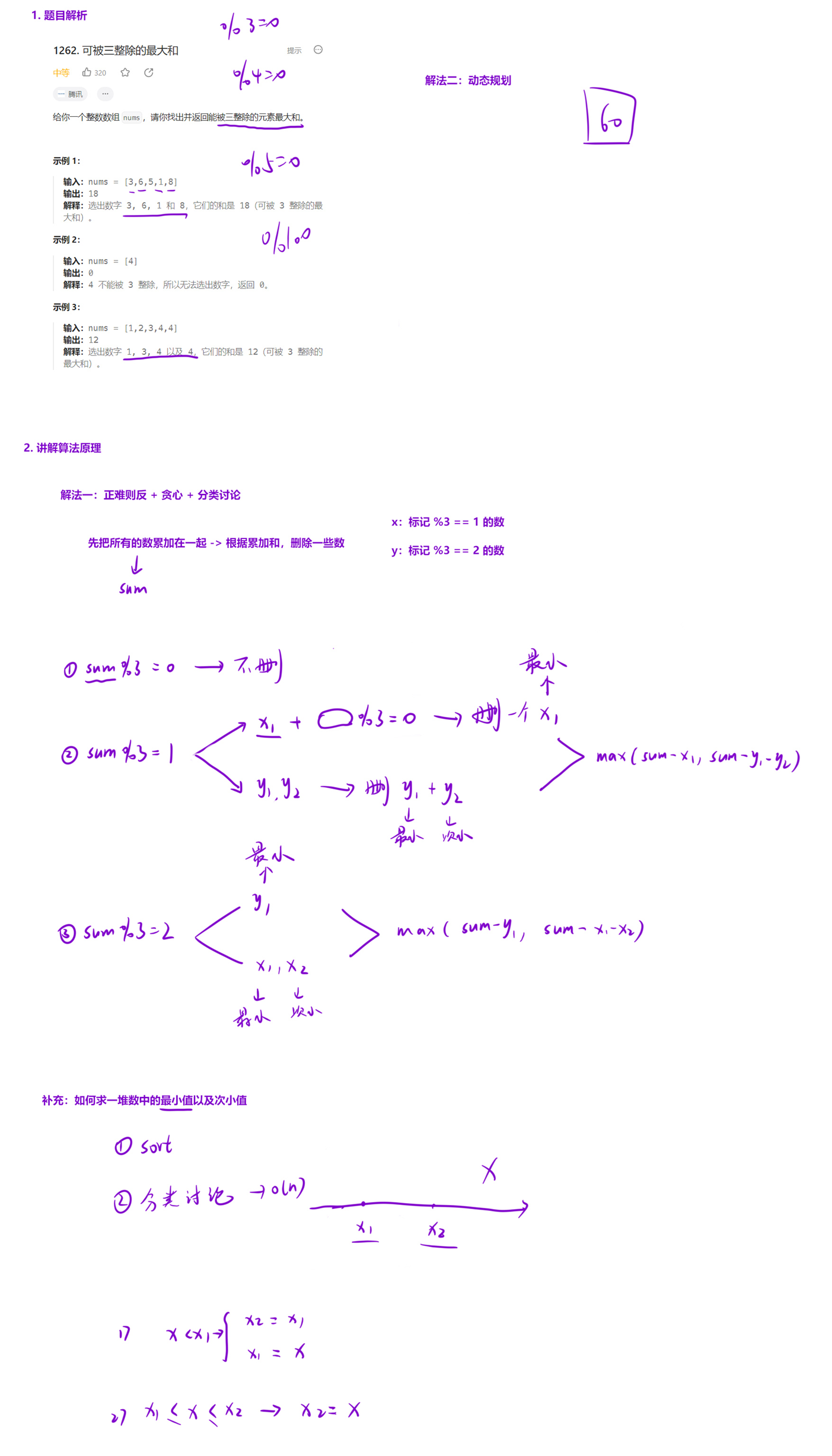 sum % 3 == 1:此时数组中要么存在一个x,要么存在两个y。因为我们要的是最大值,所以应该选择x中最小的那个数,记为x1,或者是y中最小以及次小的两个数,记为y1, y2。那么,我们应该选择两种情况下的最大值:max(sum - x1, sum - y1 - y2); - c.