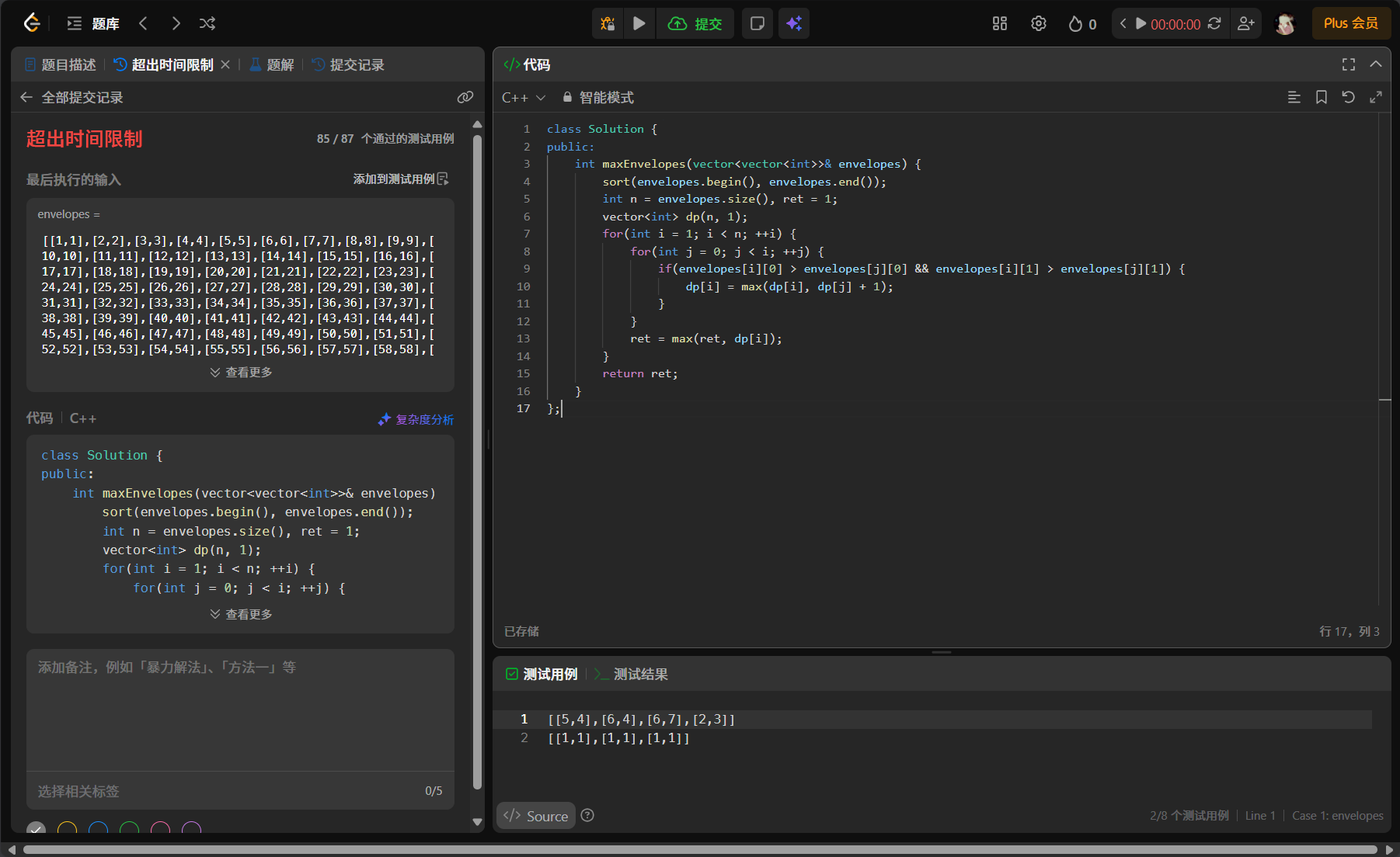 public:int maxEnvelopes(vector<vector<int>>& envelopes) {sort(envelopes.begin(), envelopes.end());int n = envelopes.size(), ret = 1;vector<int> dp(n, 1);for(int i = 1; i < n; ++i) {for(int j = 0; j < i; ++j) {if(envelopes[i][0] > envelopes[j][0] && envelopes[i][1] > envelopes[j][1]) {dp[i] = max(dp[i], dp[j] + 1);}}ret = max(ret, dp[i]);}return ret;}