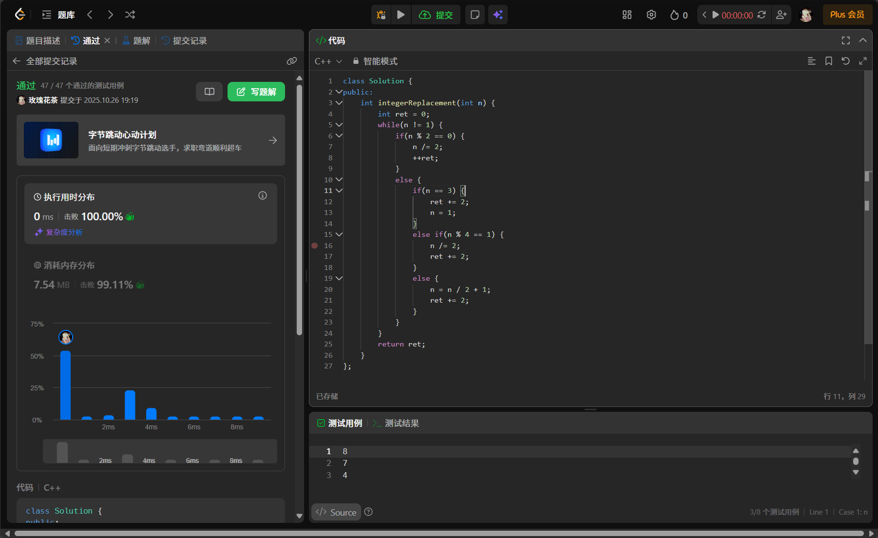 public:int integerReplacement(int n) {int ret = 0;while(n != 1) {if(n % 2 == 0) {n /= 2;++ret;}else {if(n == 3) {ret += 2;n = 1;}else if(n % 4 == 1) {n /= 2;ret += 2;}else {n = n / 2 + 1;ret += 2;}}}return ret;}