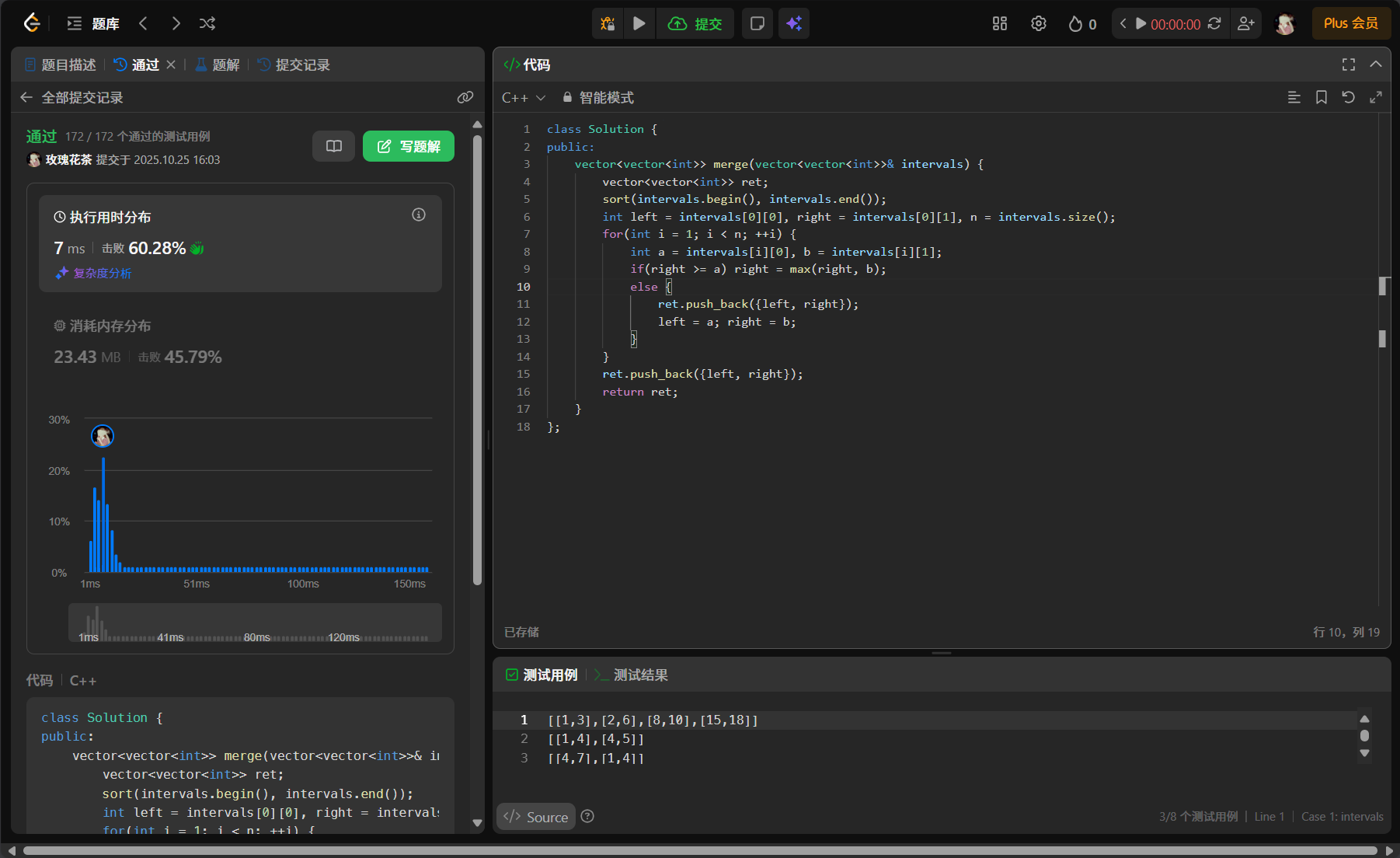 public:vector<vector<int>> merge(vector<vector<int>>& intervals) {vector<vector<int>> ret;sort(intervals.begin(), intervals.end());int left = intervals[0][0], right = intervals[0][1], n = intervals.size();for(int i = 1; i < n; ++i) {int a = intervals[i][0], b = intervals[i][1];if(right >= a) right = max(right, b);else {ret.push_back({left, right});left = a; right = b;}}ret.push_back({left, right});return ret;}