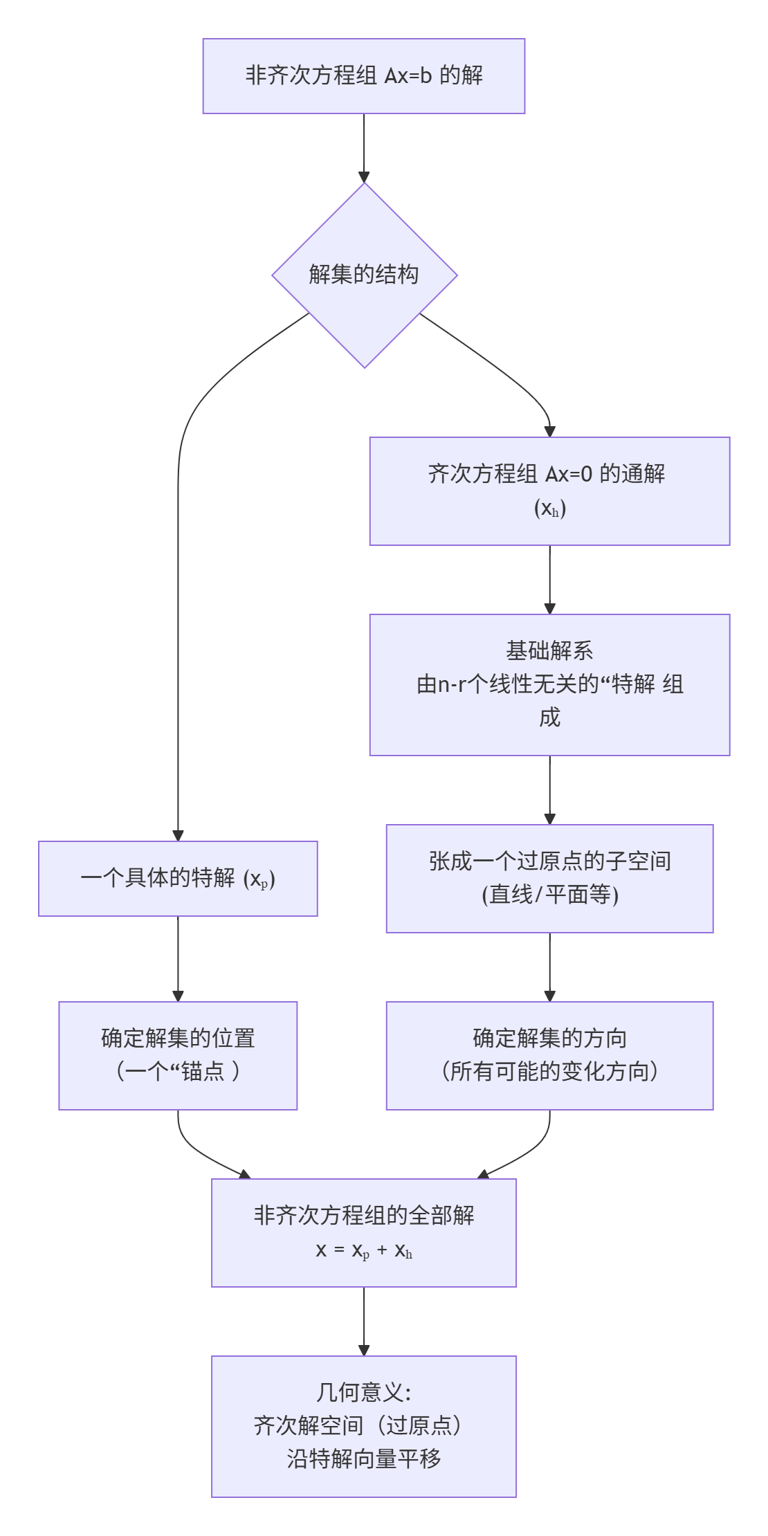 构成方式 | 基础解系的线性组合张成的空间 | 一个特解 (锚点) + 齐次解空间 (方向) |