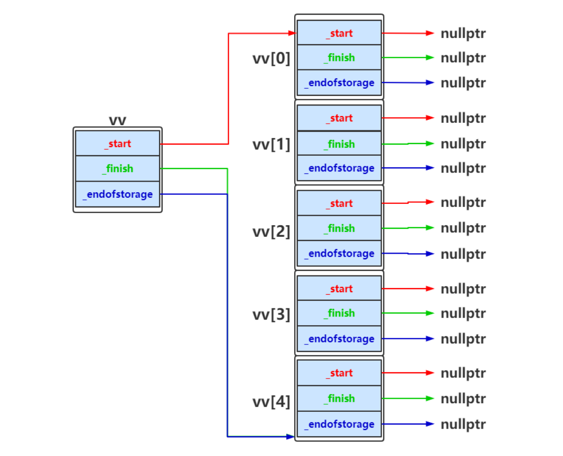 使用标准库中 vector 构建动态二维数组时与上图实际是一致的。