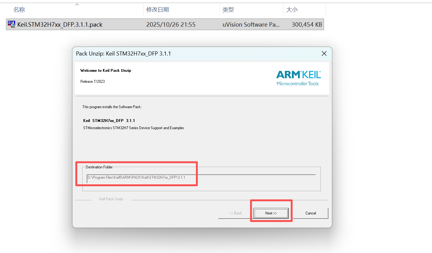 下载完成后,双击pack文件进行安装,会自动安装到keil的安装路径中,再电机Next: