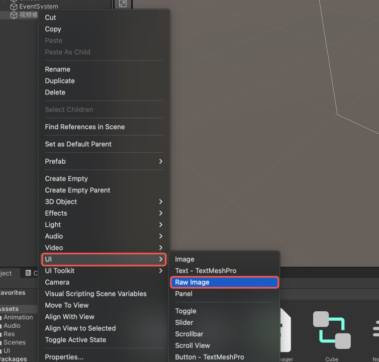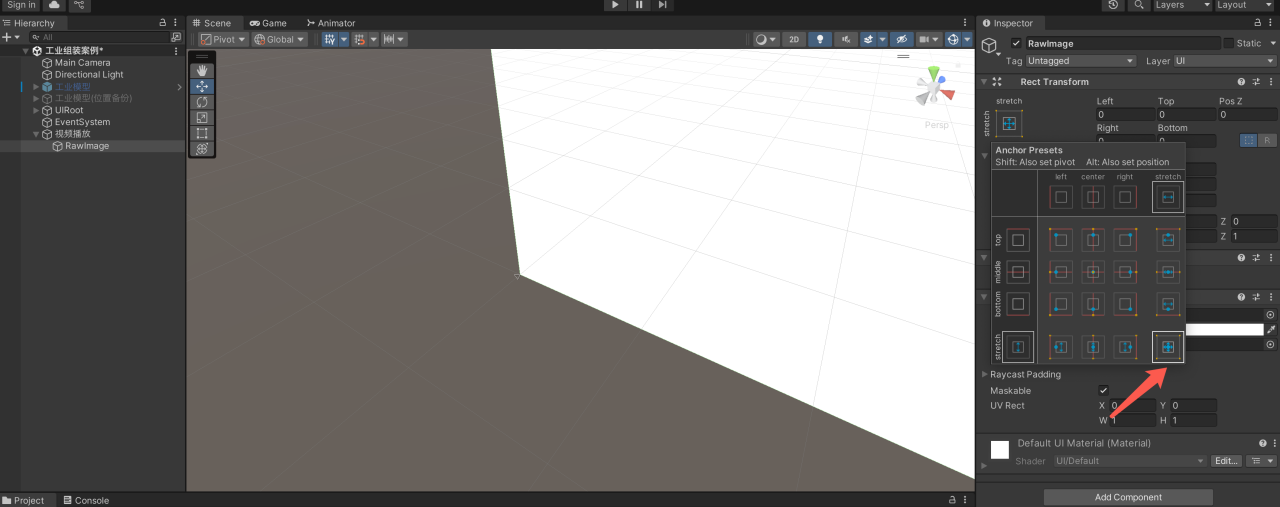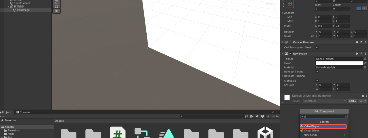 3. 在“视频播放”画布上,创建一个“Raw Image”。