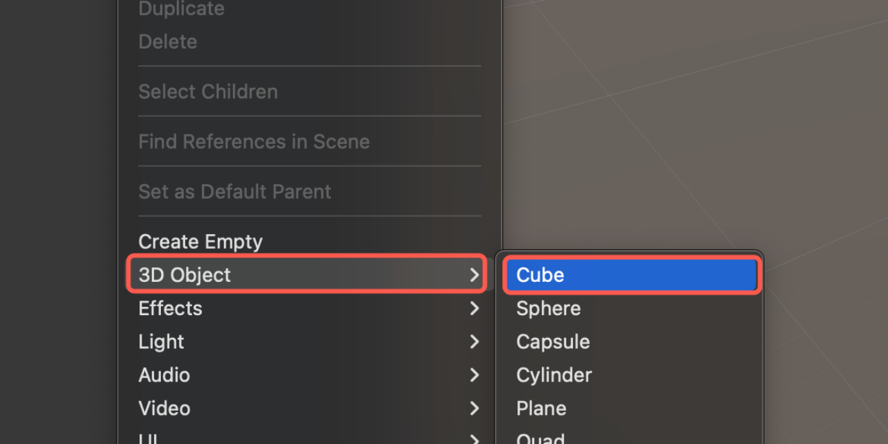 2. 在Hierarchy面板在单击右键,在弹出的面板中选择 3D Object->Cube,创建一个Cube对象。