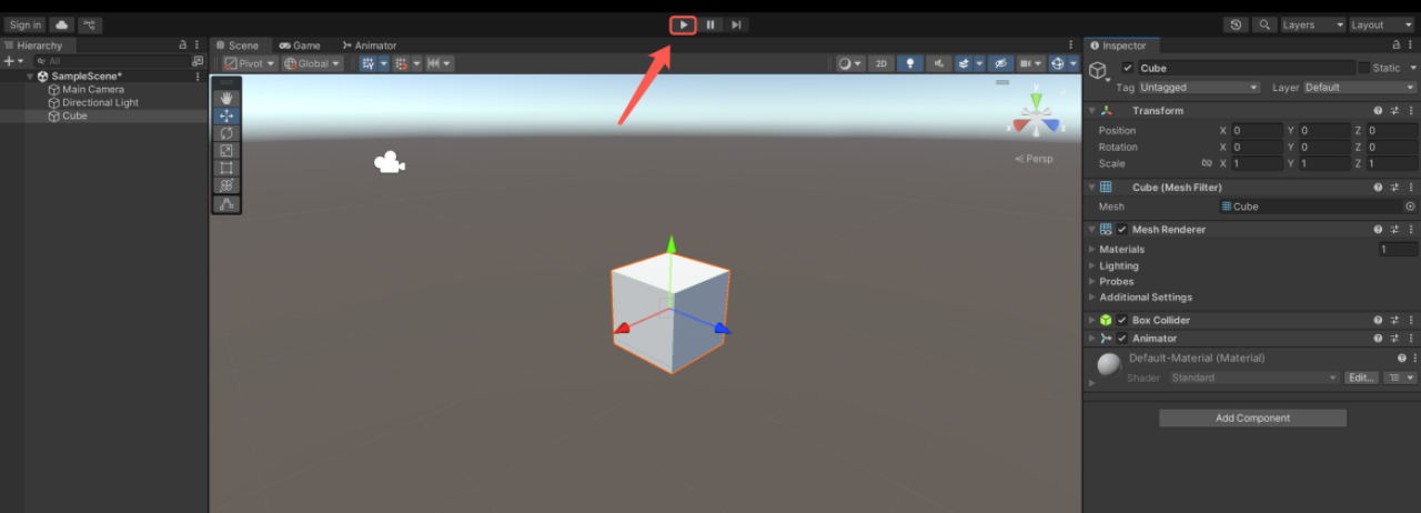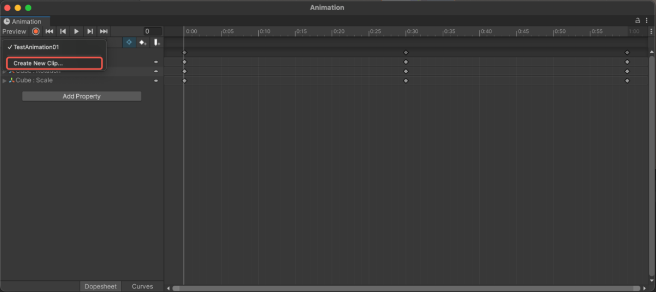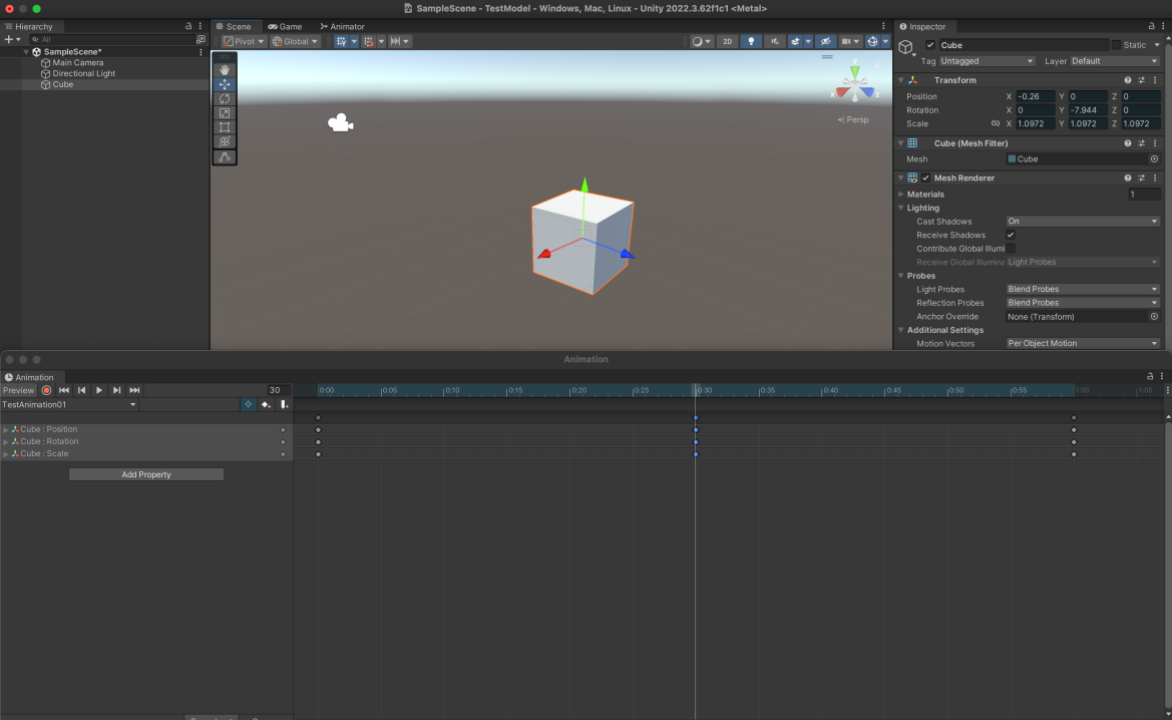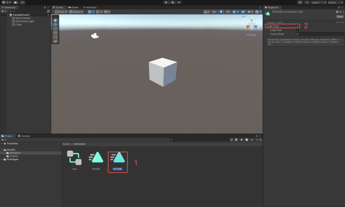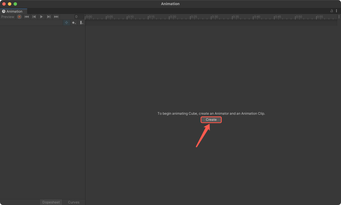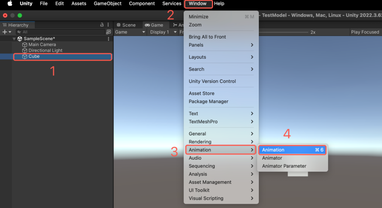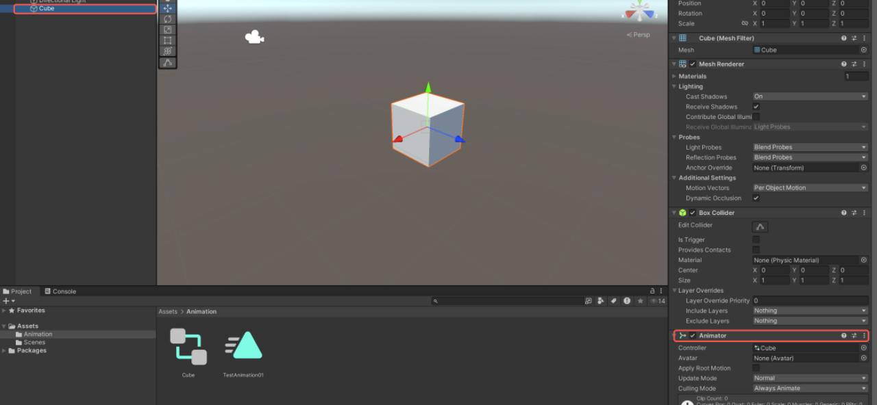 3. 选中上面创建的 Cube 对象,点击 Window->Animation->Animation 按钮,创建一个动画控制器。