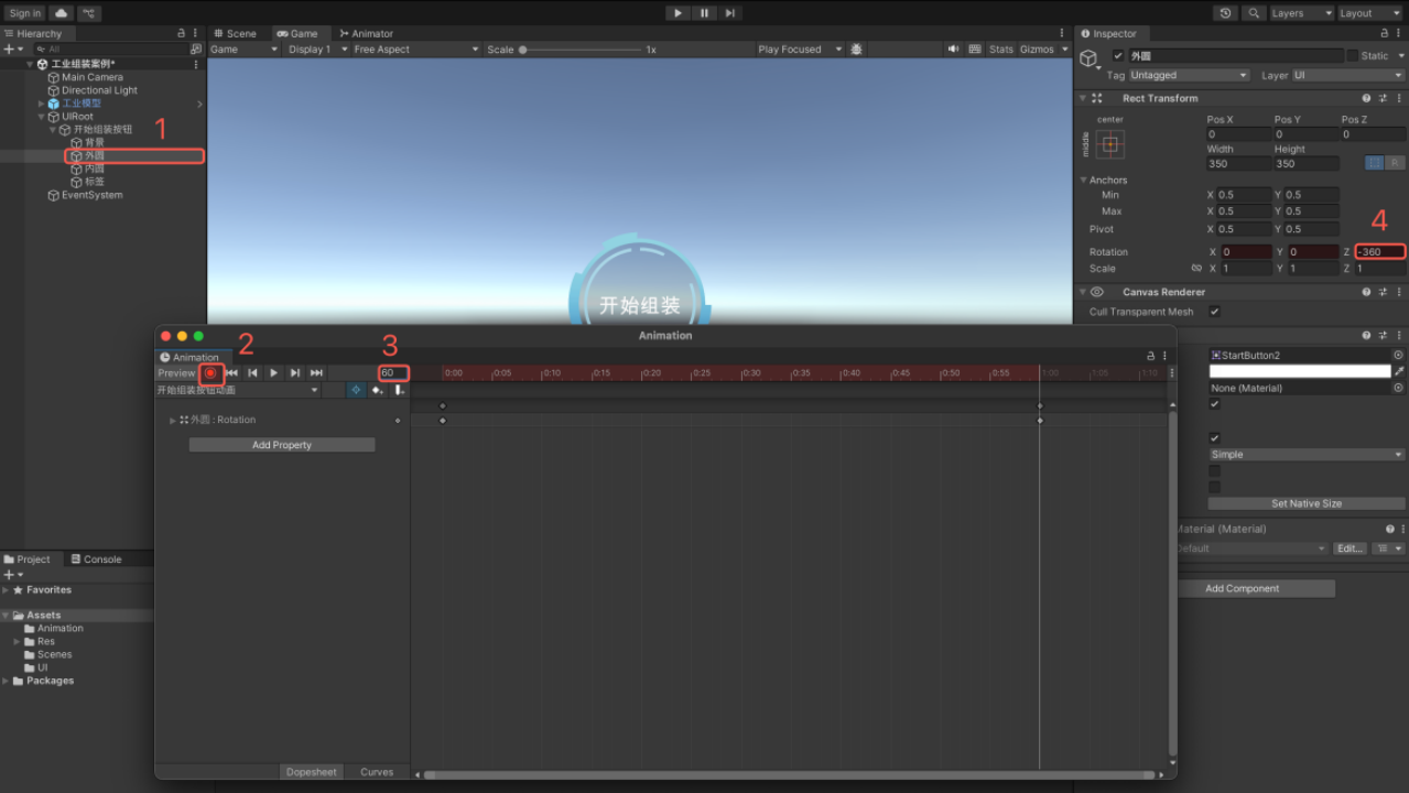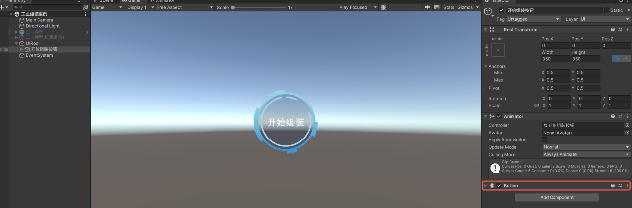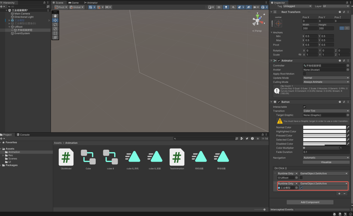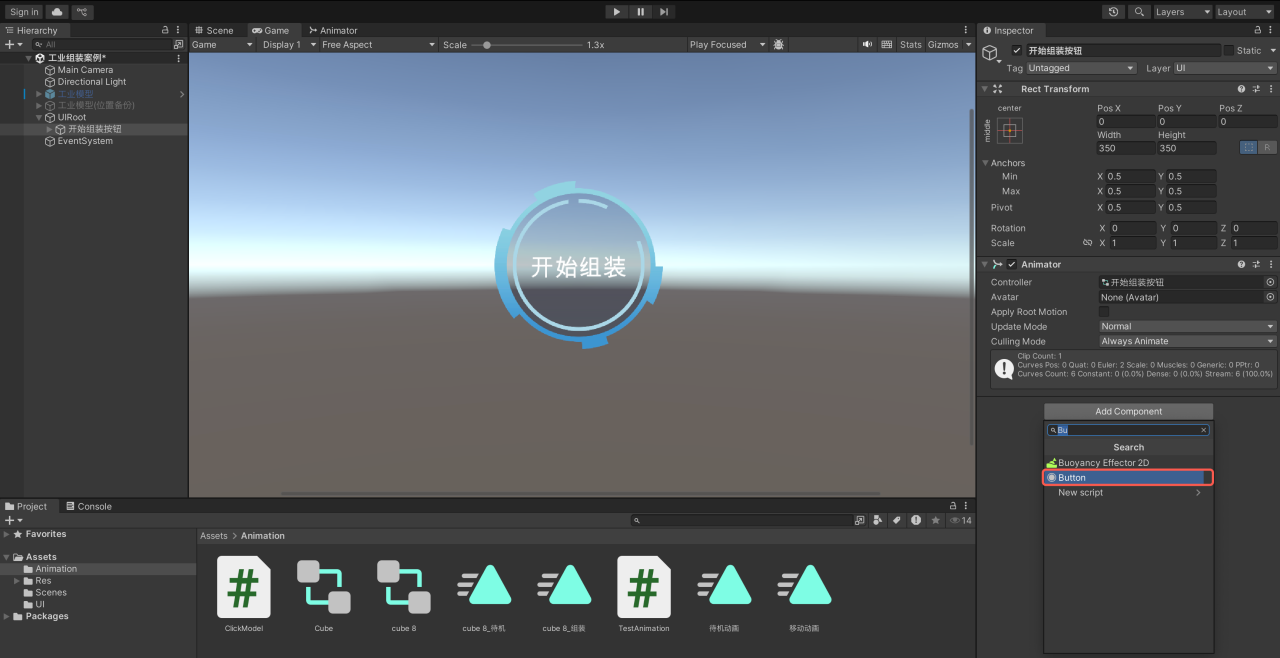 1. 的选中上面创建的 “开始组装按钮” 对象,点击 Window->Animation->Animation 按钮。创建一个动画控制器,命名为“开始组装按钮动画”。