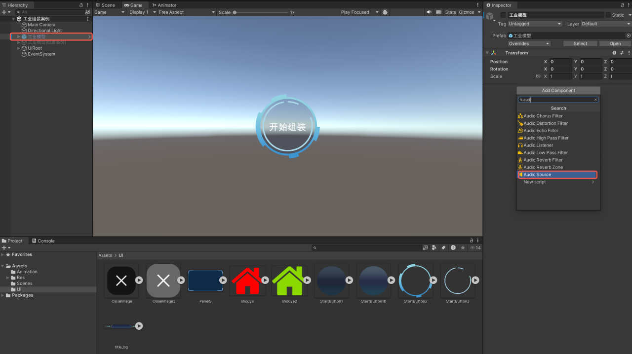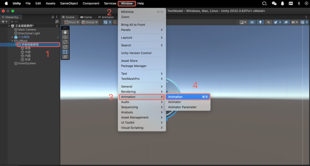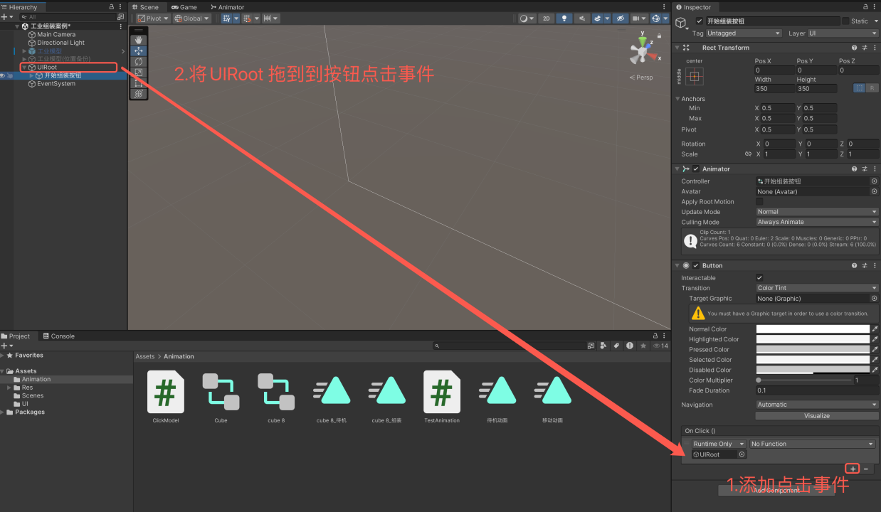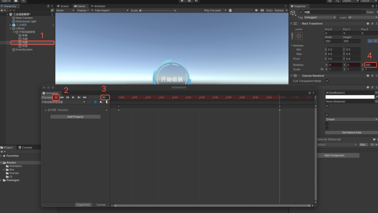 1. 的选中上面创建的 “开始组装按钮” 对象,点击 Window->Animation->Animation 按钮。创建一个动画控制器,命名为“开始组装按钮动画”。