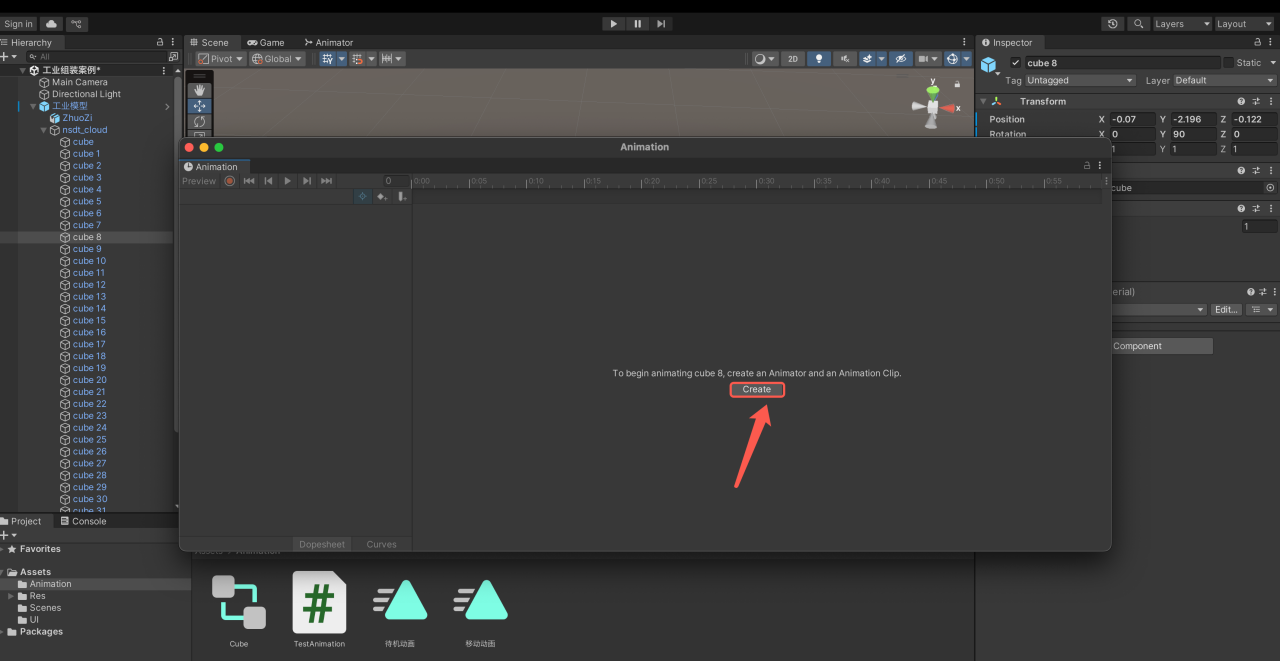 4. 再弹出的动画控制器面板,点击 “Create” 按钮,创建一个动画片段。