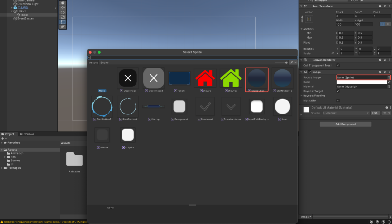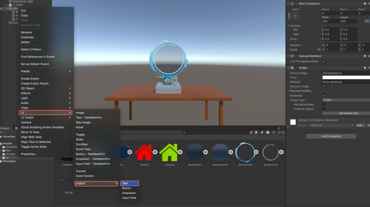 4. 创建一个Image,将 Source Image 设置为“StartButton1”。并调整图片宽和高设置为(350,350)并命名为“背景”。