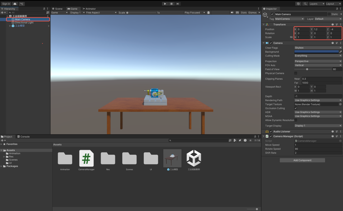 2. 将 Main Camera 位置调整为(0,1.2,-4)。