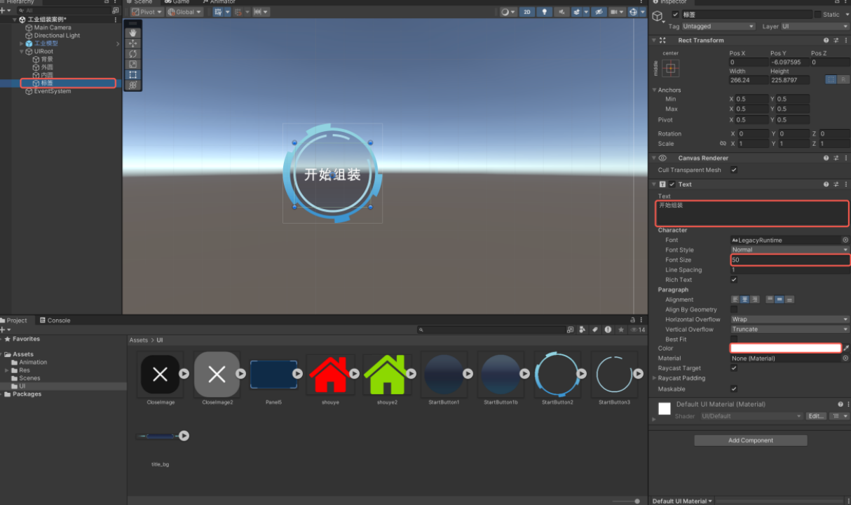 6. 创建一个 Text,命名为“标签”,文本内容设置为“开始组装”,并调整合适的字体大小。