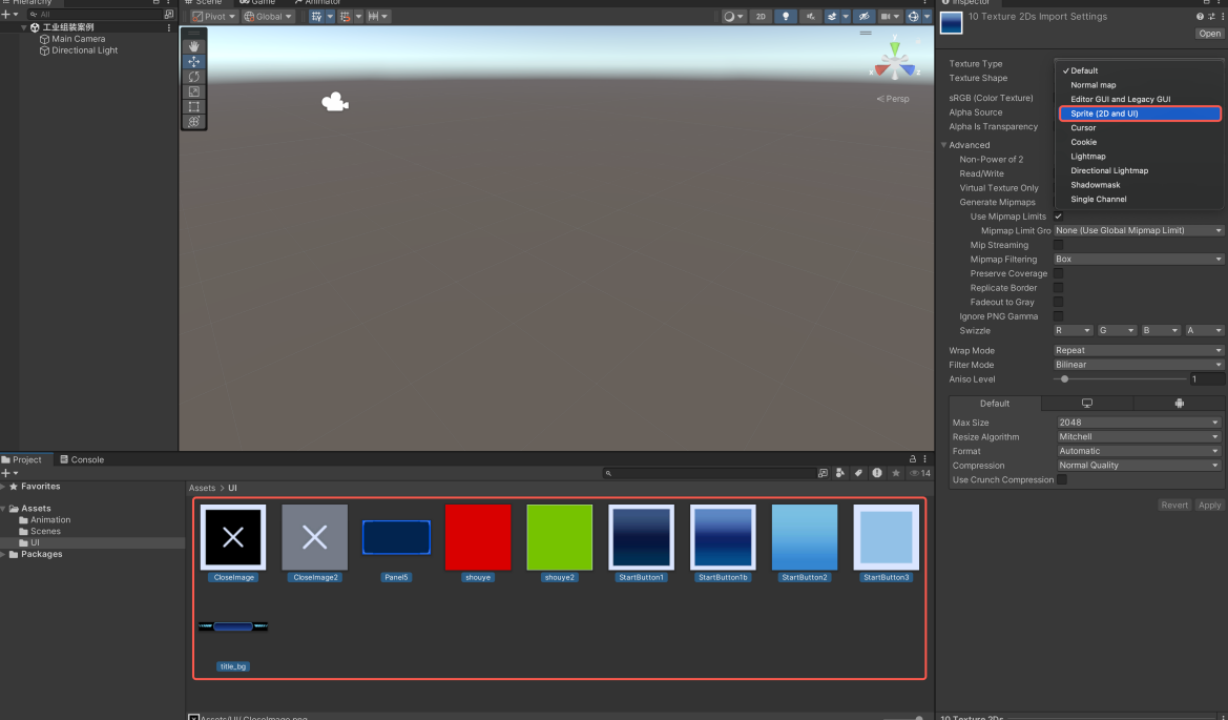 3. 导入素材提供的“UI”文件,全选所有UI图片,将Texture Type 改成 Sprite(2D and UI)。