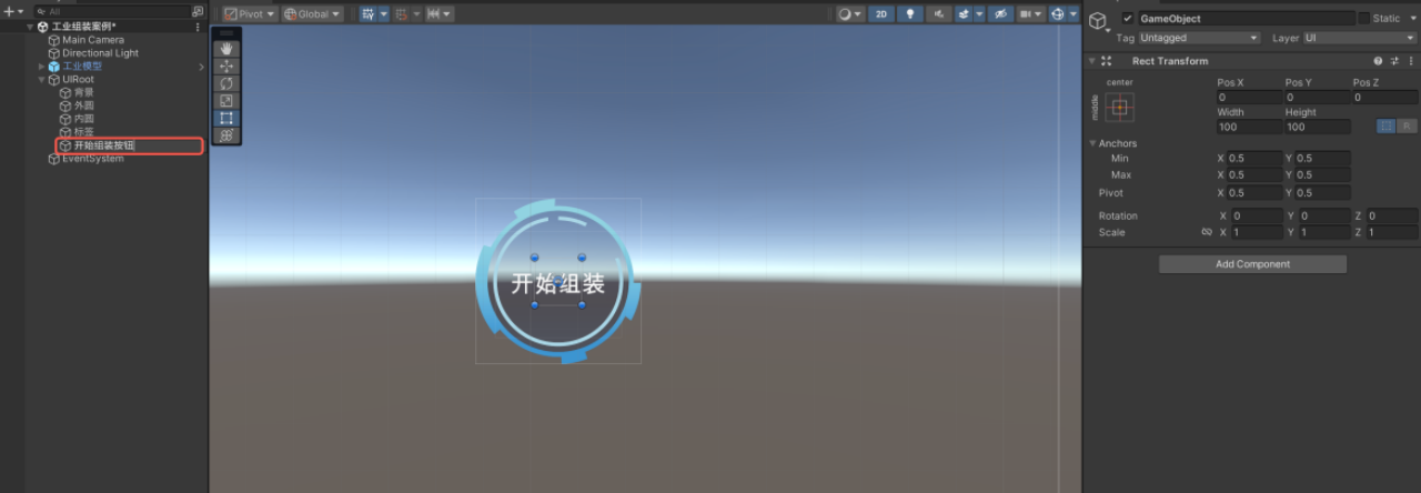 10. 给“开始组装按钮”对象,添加 Button 组件。