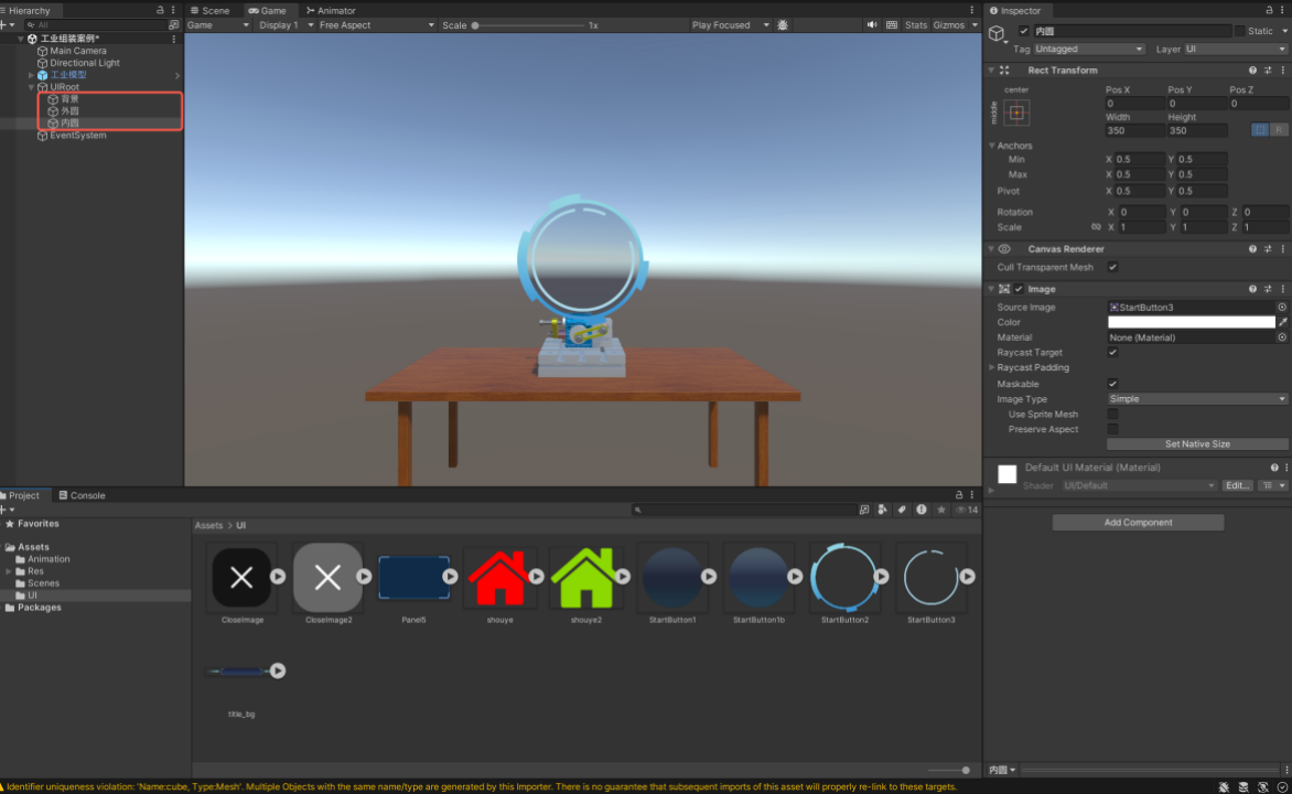 5. 将上面创建的 “背景” 对象,复制2份,分别命名为“外圆”、“内圆”,并将“外圆”的 Source Image 设置为 “StartButton2”,“内圆”的Source Image 设置为 “StartButton2”。