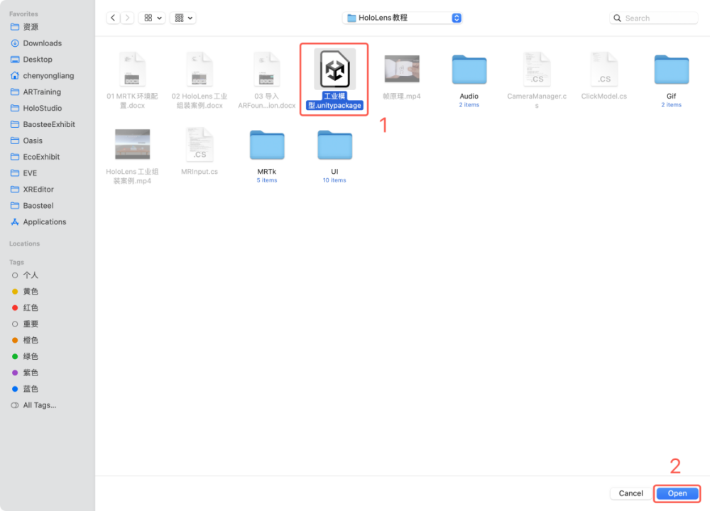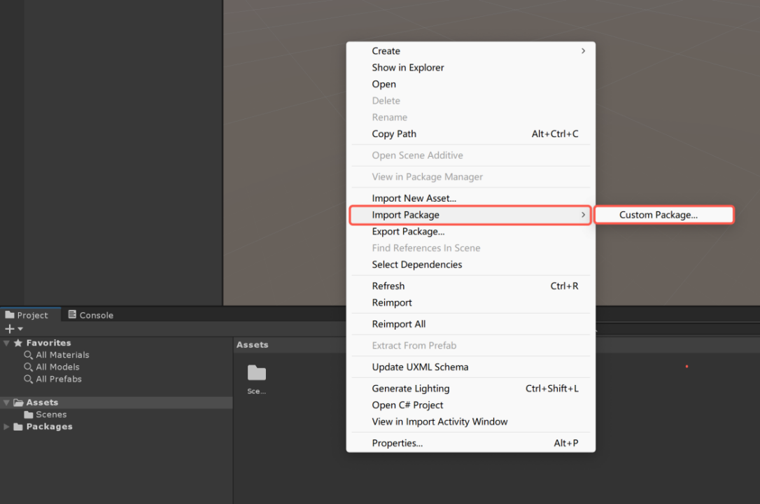4. 在 Assets 单击右键,再弹出的面板中点击 Import Package->Custom Package... 按钮,导入“工业模型.unitypackage”。