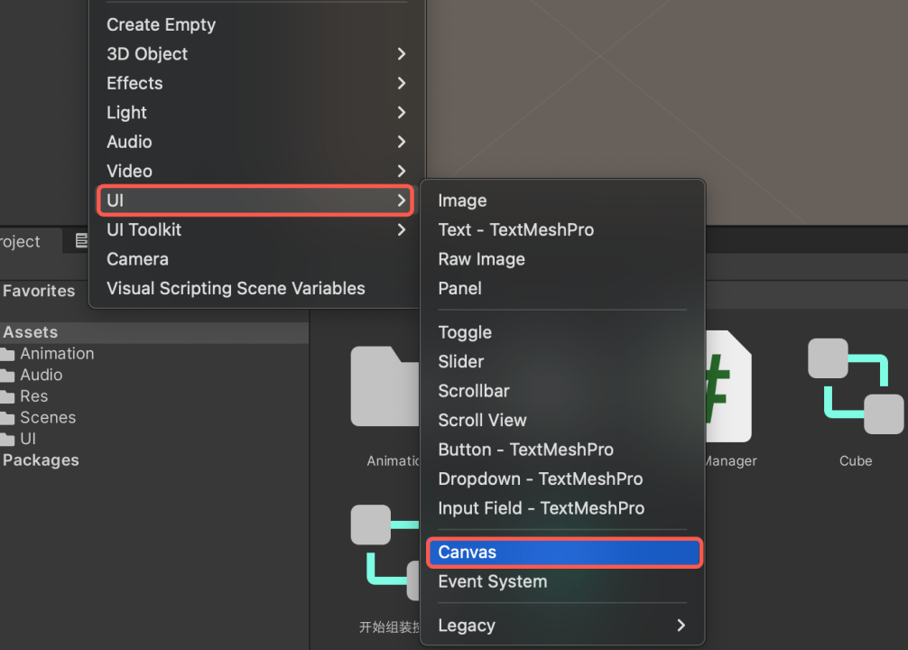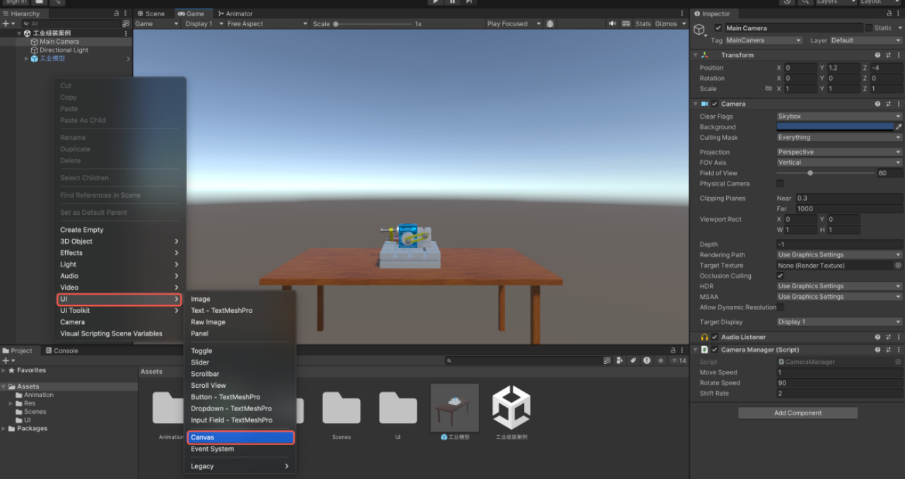 3. 创建一个 Canvas 命名为“UIRoot”。